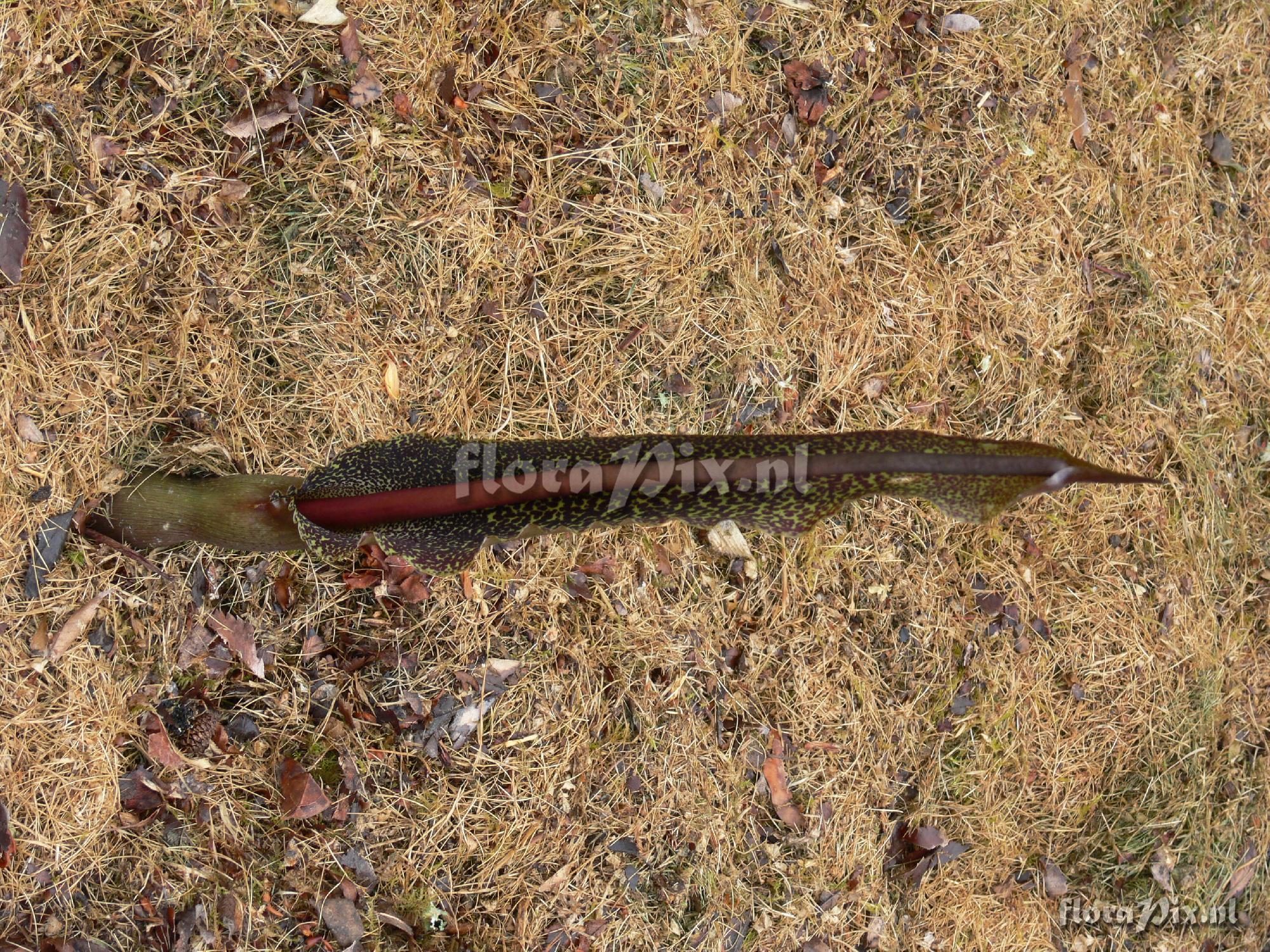 3513 - Arisaema (Garden) - 2012-08-14(Dimension: 2030 x 1550 pixels - Counter: 12159) Sauromatum venosum ![]() (Uploaded as: amorphopallus ) Locality: New Zealand Photographer: John Speed Note: This appeared un-introduced in my asparagus patch 6 or 7 years ago. I thought it was an arisaema judging by the spotted stem and single tri-lobed leaf. However it flowered two years ago and certainly surprised me. About 3 or 4 leaves grew last year but only the one flower at about 60 cm tall. I decided to lift the tuber this season and was again surprised to find about 30 "bulbs", the largest being over a kilo. I have no idea what it is or where it came from. If any New Zealand members would like a tuber or two please contact me. (Sent: Arisaema-l@science.uu.nl) Identification: solved