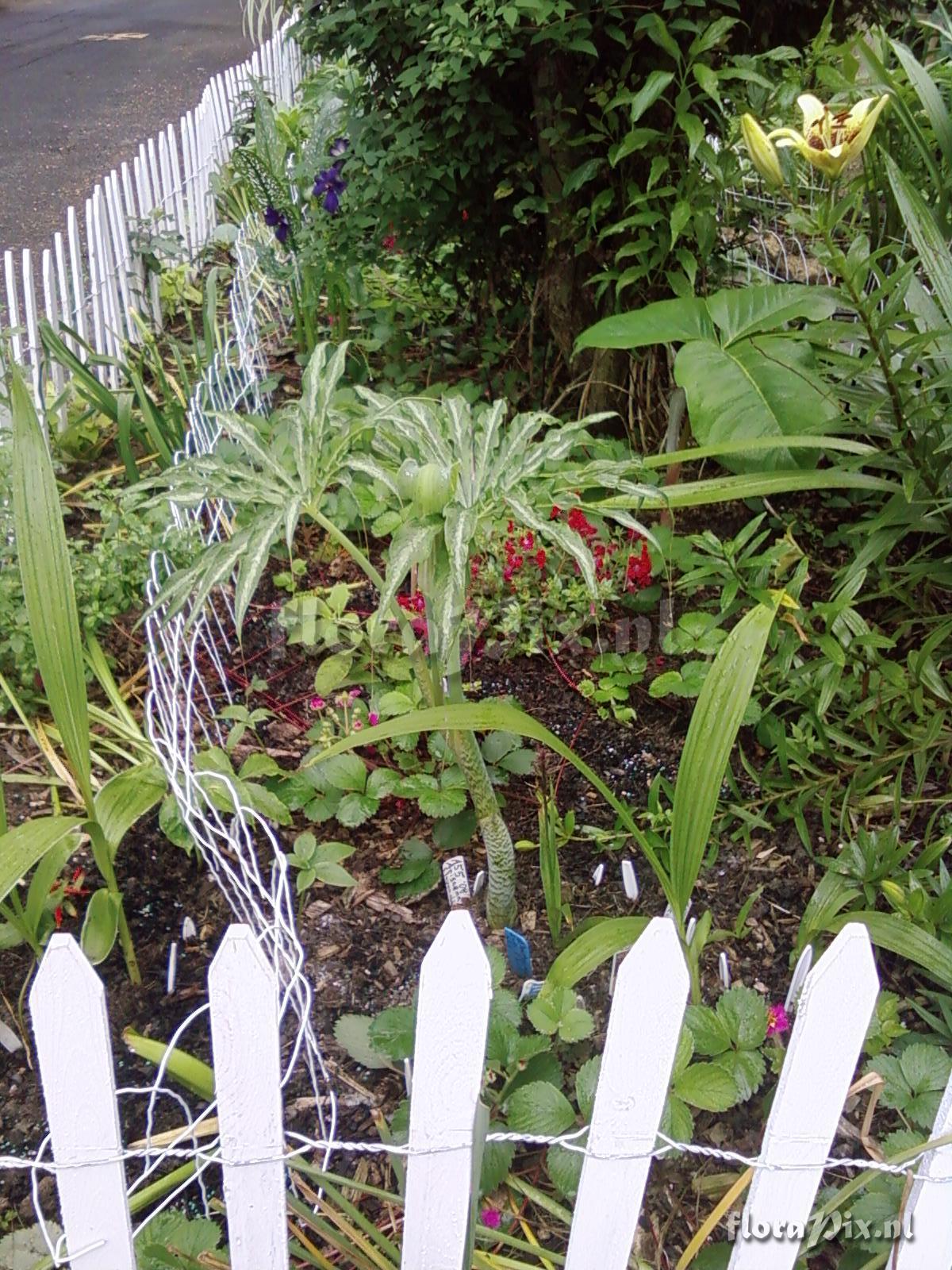 865 - Arisaema (Garden) - 2009-06-24(Dimension: 1230 x 1650 pixels - Counter: 8126) Arisaema Kaichen A-55 ![]() Photographer: Bonaventure Magrys Note: Hi everyone, One spectacular success in this season of no sun here for two weeks and nearly daily rain in central coastal New Jersey has been this Arisaema. Originally received as A-55, Arisaema flavum, from Kaichen last winter, that it definitely is not. It has leaflets like a consanguinium and the camera really brings out the silver stripe in each leaflet center, not as apparant in normal veiw. However it has 2 leaf stalks per stem joining about 10cm above ground level and is very robust and has not rotted down as many of my consanguineums and others. Notice the patterned stem. Any ideas? Bonaventure Magrys Cliffwood Beach, NJ, USA