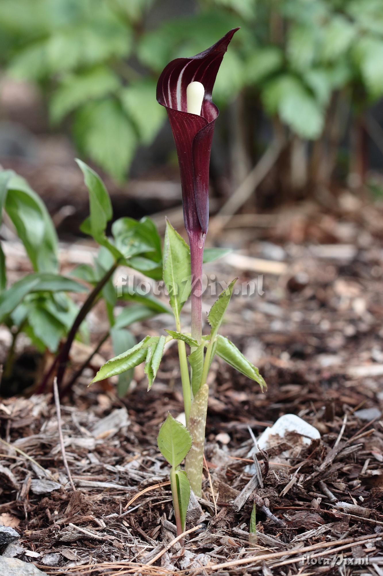 (Dimension: 1363 x 2050 pixels - Counter: 14115) Arisaema engleri x sikokianum Locality: USA - Rhode Island - East Greenwich Photographer: Erick Adams Note: In 2007 I managed to pollinate my last living A. engleri with A. sikokianum pollen before it expired. The following year only 13 seedlings emerged. As of this year (2012) only 3 of these F1 plants are left and the largest has finally bloomed. (Sent: Arisaema-l@science.uu.nl)