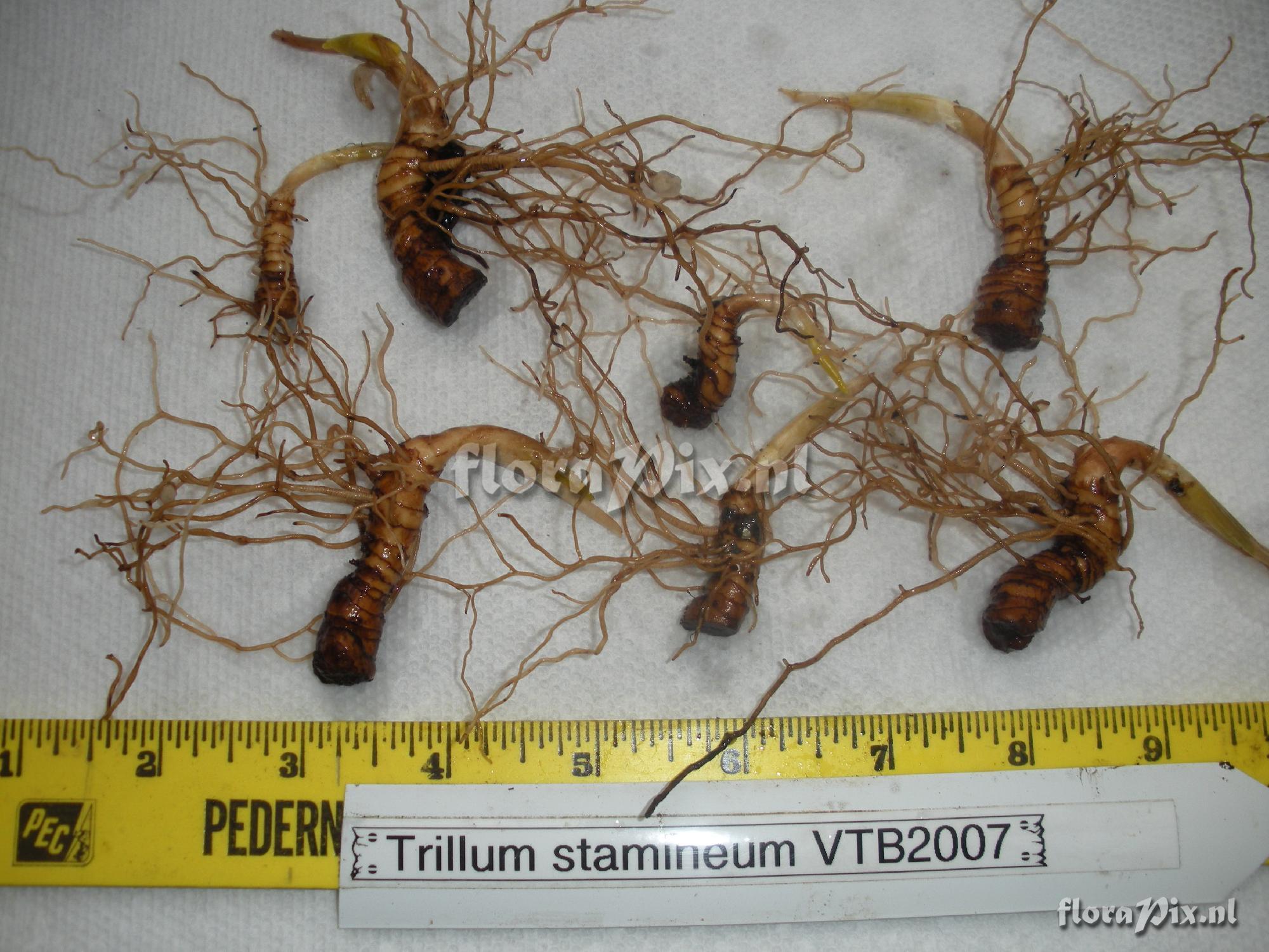 2403 - Woodland (Garden) - 2009-12-18(Dimension: 2030 x 1550 pixels - Counter: 5351) Trillium stamineum ![]() Locality: USA - Jefferson Co., Alabama - Picture taken at HBG WFNursery, Trillium Research on 17 Dec 2009. Photographer: Harold Holmes Note: Note: Rhizome shows demarcation in color before and after decapation. This is the terminal bud section that was decapated in May 2007. The lighter color part of the rhizome is growth since 2007. It may confirm John Gyer's statement that there are 3 sheeths (or whatever John calls thoes things) per year and therefore 3 rings per year. I can only guess the darker color comes from the Jefferson Co. soil and the lighter color comes from my soil mix. (Sent: Trillium-l@nic.surfnet.nl)