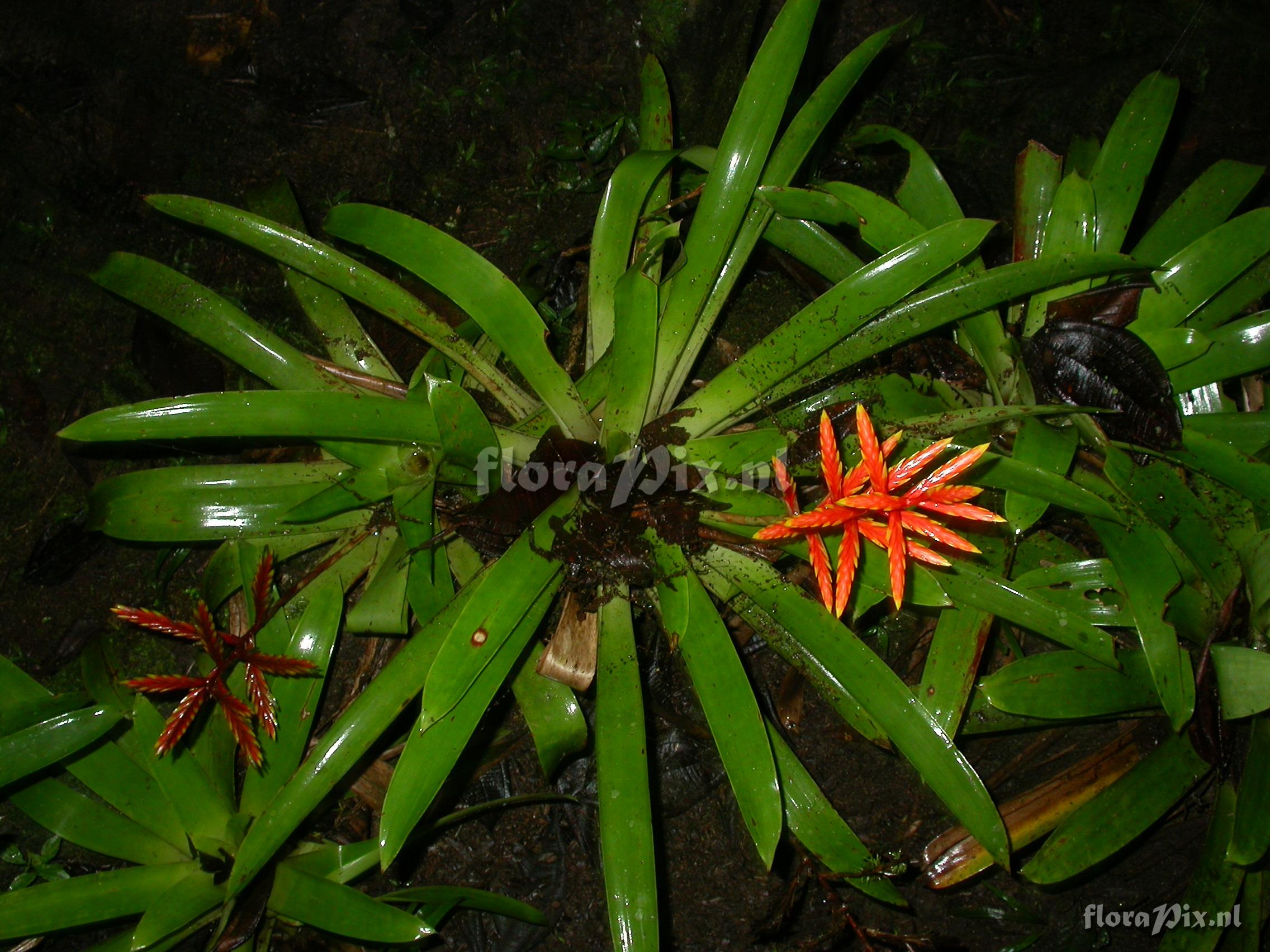 (Geladen als: Tillandsia guzmaniaartig ) Verzamel locatie: Ecuador - Prov. Zamora-Chinchipe; close to Zamora; entrance of Podocarpus NP ""Bombuscaro"", tall premontane moist forest Fotograaf: Florian Werner Opmerking: Col.: Werner, F.A. 3147 (08-09-2005) Vegetatively much resembles fw3105 (a compact mid-storey Guzmania). Showy erect bright-red inflorescence (except yellow flower-bract tips) Determinatie: Opgelost