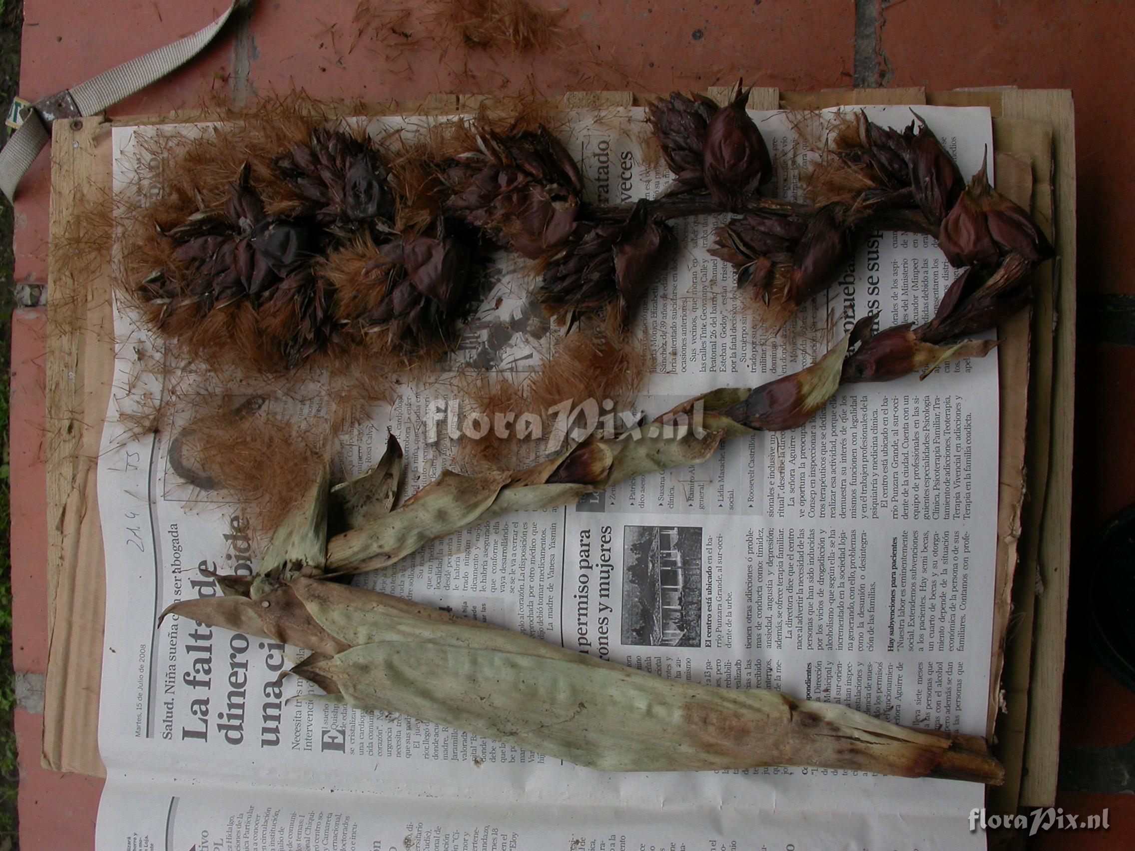 Verzamel locatie: Ecuador - Prov. of Zamora-Chinchipe, area of Estación Cientifica San Francisco (S 03°58“, W 79°04“ ), road Loja-Zamora, ca. 35 km from Loja; moist montane forest Fotograaf: Florian Werner Opmerking: Col.: Werner, F.A. 3058 (20-04-2010) inf. erect, large, with globose bracts subduing every parial infl. Leaves with very broaf base, tapering off ver gradually (but tip rounded).