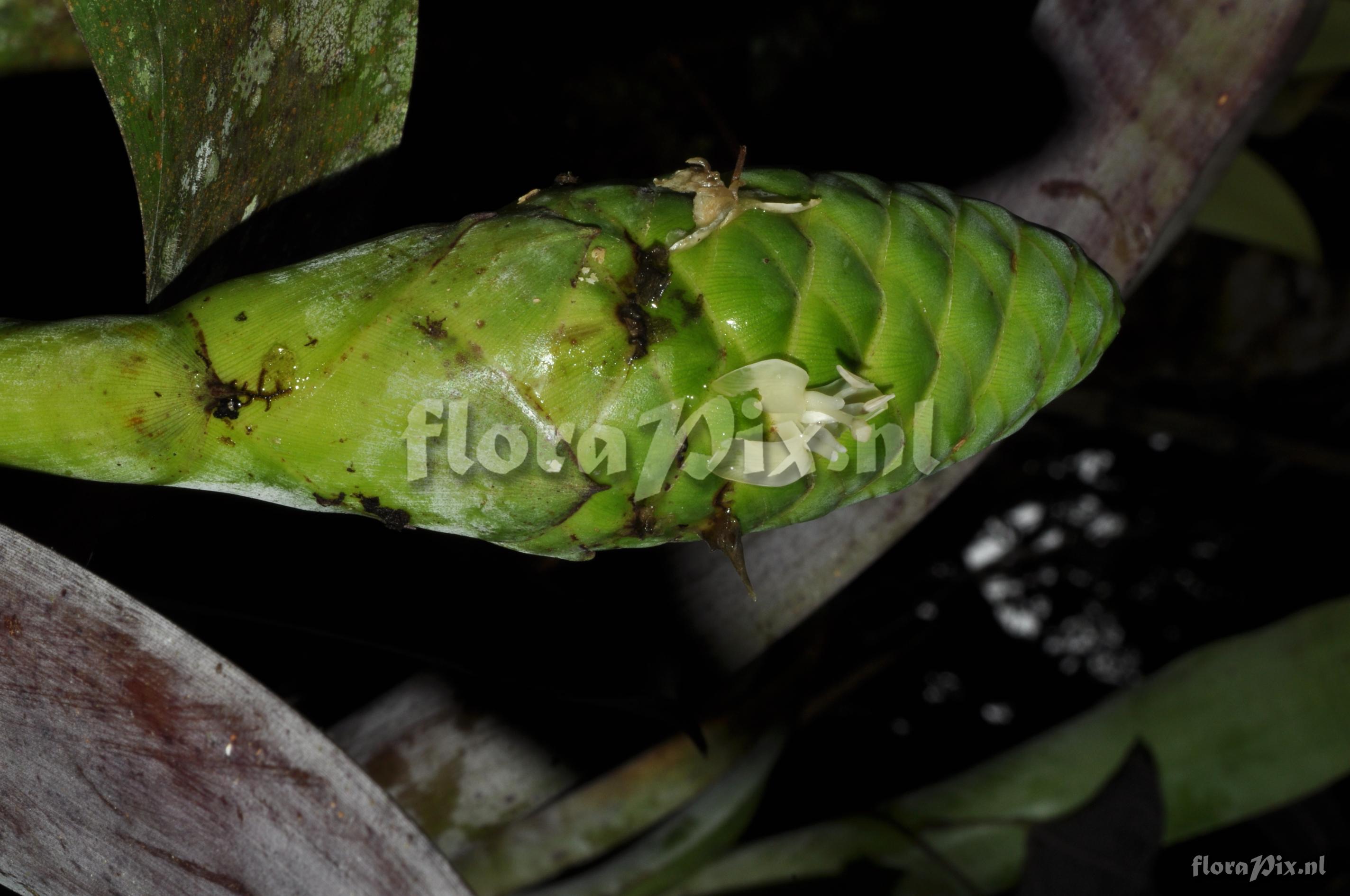 (Geladen als: Guzmania ) Verzamel locatie: Ecuador - Prov. of Zamora-Chinchipe, area of Estación Cientifica San Francisco (S 03°58“, W 79°04“ ), road Loja-Zamora, ca. 35 km from Loja; moist montane forest Fotograaf: Florian Werner Opmerking: Col.: Werner, F.A. 3129 (10-04-2011) flowers white. Plants usually tilted, inflorescence erect. Determinatie: Opgelost