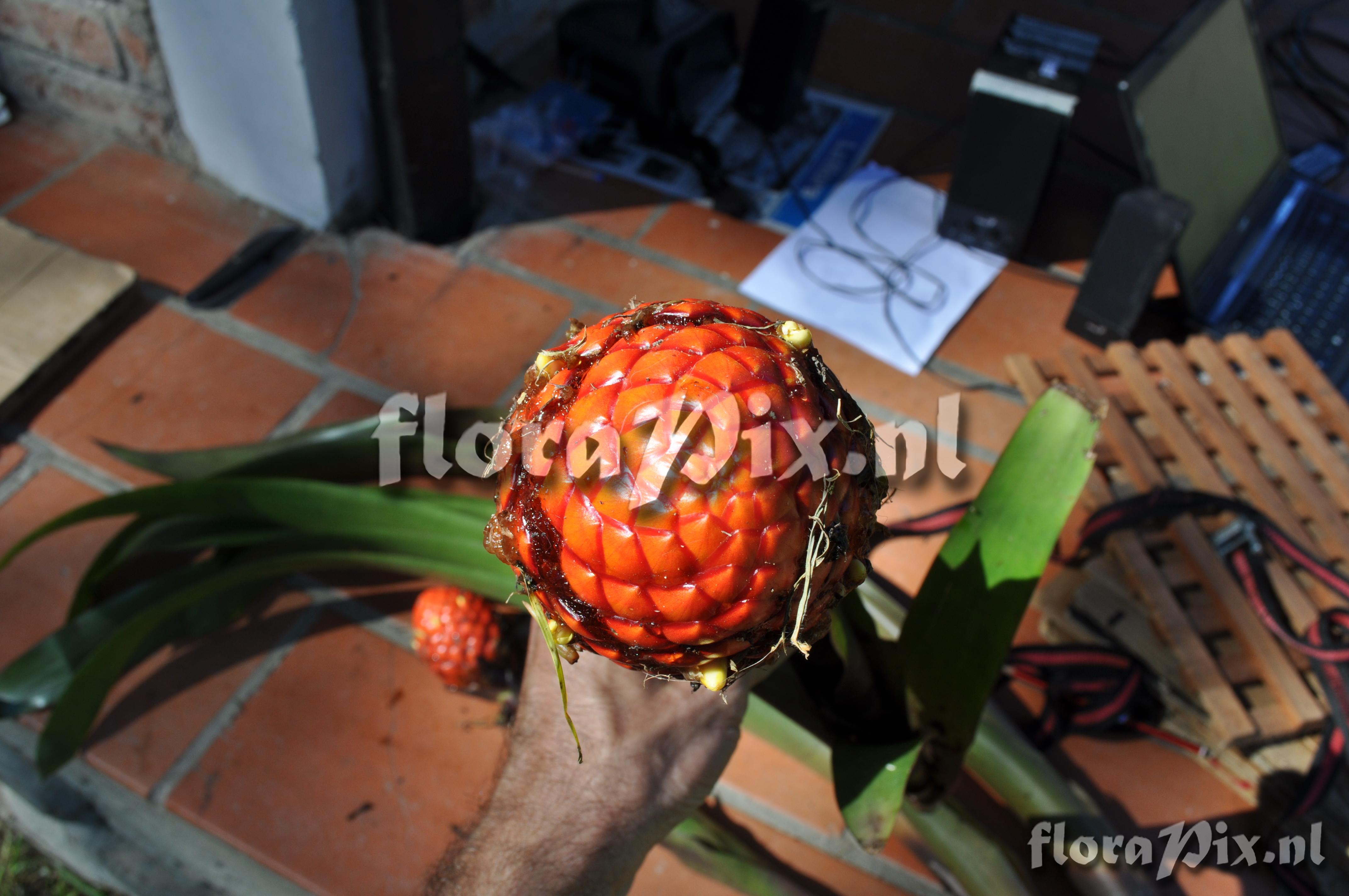 (Geladen als: Guzmania ) Verzamel locatie: Ecuador - Prov. Zamora-Chinchipe; close to Zamora; entrance of Podocarpus NP ""Bombuscaro"", tall premontane moist forest Fotograaf: Florian Werner Opmerking: Col.: Werner, F.A. 3120 (08-04-2011) The bright glossy brich-red bracts forming a pine-cone-like struxcture filled with gue. Petars mild yellow. Determinatie: Opgelost