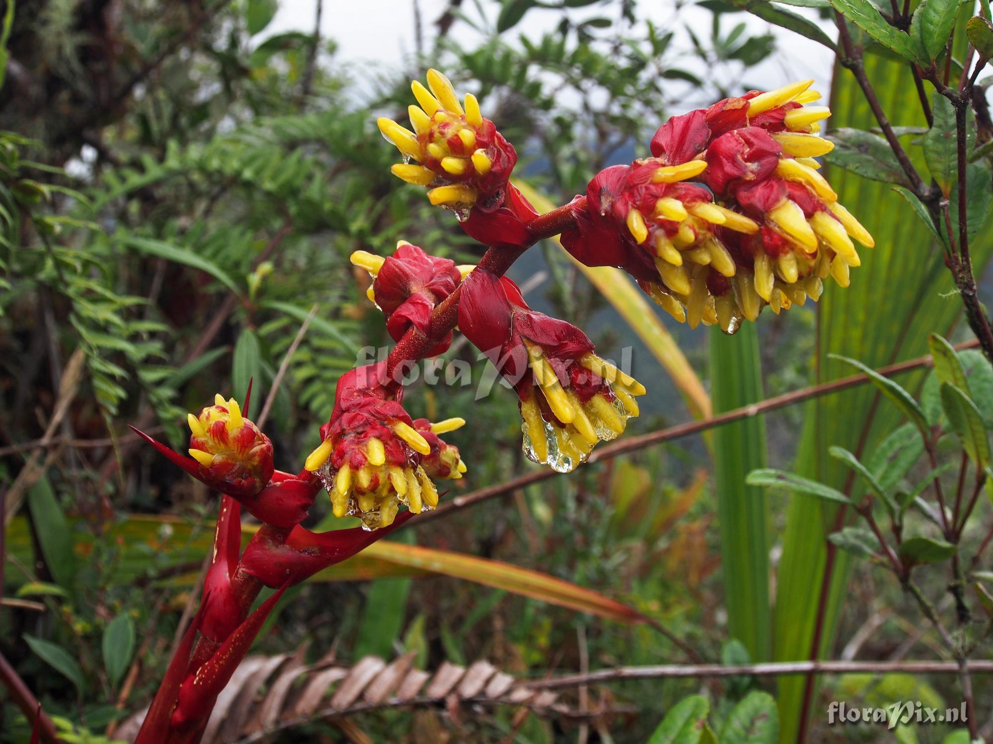 Locality: Ecuador, Zamora-Chinchipe Province - 1st 3 pictures are from site on road from Los Encuentros heading east toward the Condor Mts in Zamora-Chinchipe Province at an altitude of 1632 meters. These plants were very large - I would say they were almost 1.25 meters tall. They were in full anthesis at the time of photographing them. They were growing terrestrially along the road cuts among the ever present deep creeping fern that covers these areas. Quite spectacular. This area did not appear to be overly wet. The 2nd 2 pictures (plant with red foliages are from a plant at a different location (Limon Antenna Road in Morona-Santiago Province growing at an altitude of 2284 meters. These plants at higher altitude were not fully open, so at the time were somewhat smaller, growing to about 1 meter high. Photographer: Jerry Raack