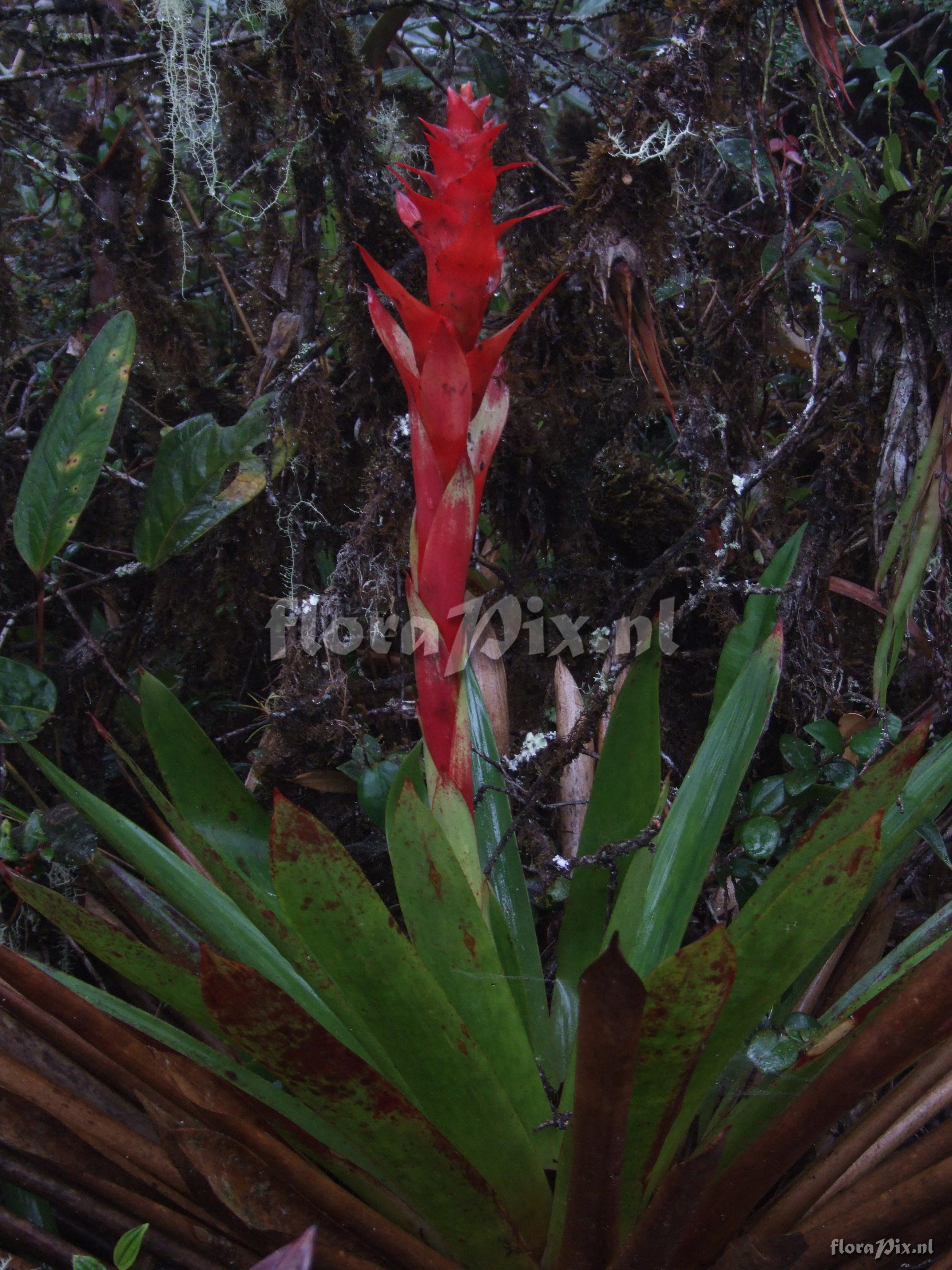 (Uploaded as: Guzmania ) Locality: Ecuador - Prov. of Zamora-Chinchipe, area of Estación Cientifica San Francisco (S 03°58“, W 79°04“ ), road Loja-Zamora, ca. 35 km from Loja; moist montane forest Photographer: Florian Werner Note: Col.: Werner, F.A. 1958 (23-04-2006) "common around 2500m; leaves thin and very brittle; bracts bright red, flowers white." Identification: solved