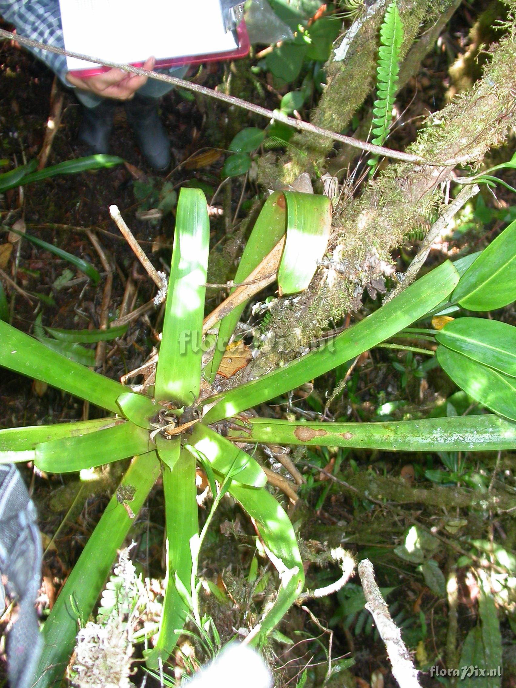 Locality: Ecuador - Prov. of Zamora-Chinchipe, area of Estación Cientifica San Francisco (S 03°58“, W 79°04“ ), road Loja-Zamora, ca. 35 km from Loja; moist montane forest Photographer: Florian Werner Note: Col.: Werner, F.A. 2829 (14-12-2009) "peculiar purplish red leaf pigmentation; gestalt of a Guzmania; leaf tips rolled down in a peculiar way. Who is this?"