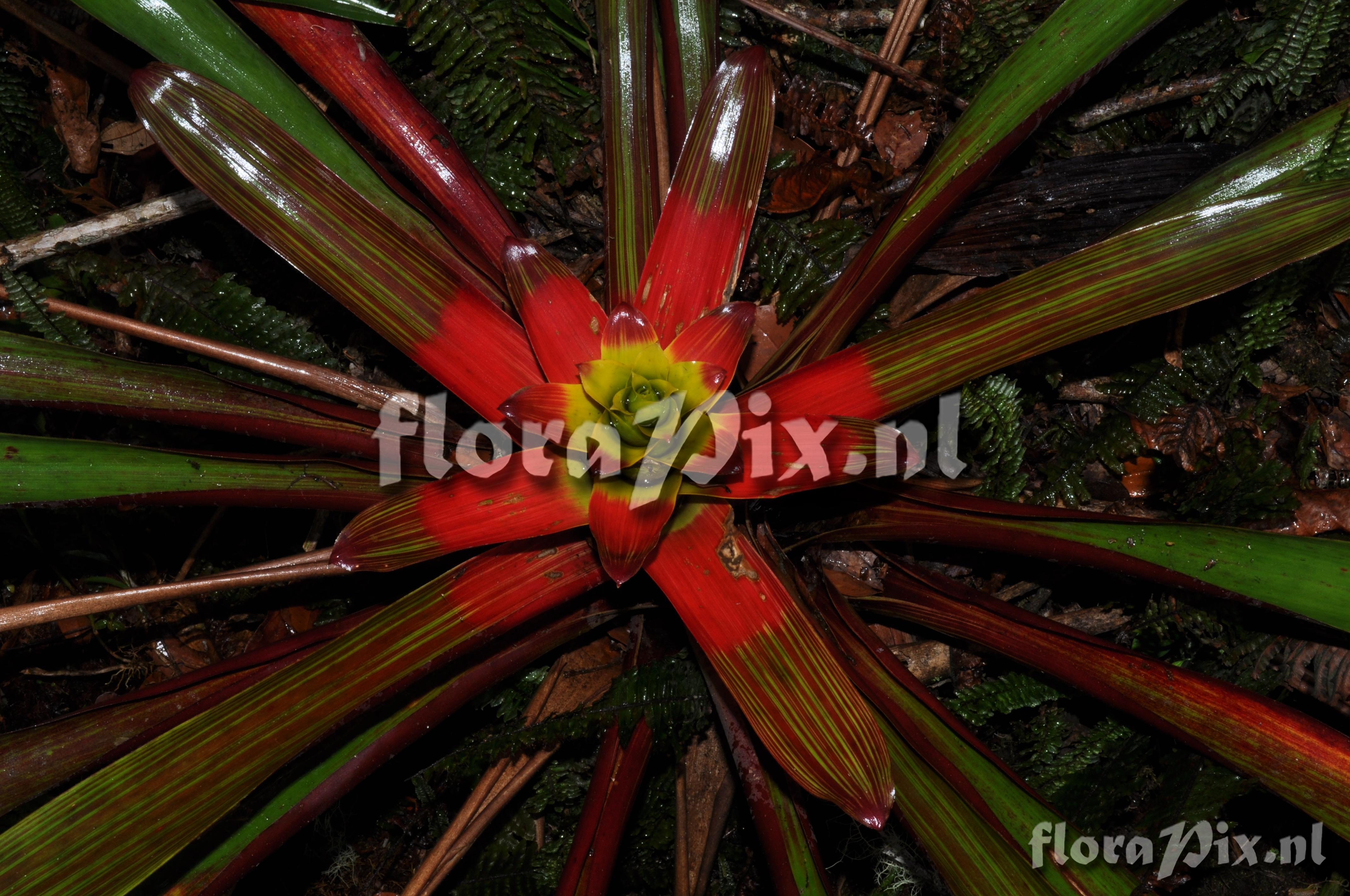 (Uploaded as: Guzmania ) Locality: Ecuador - Prov. Zamora-Chinchipe; close to Zamora; entrance of Podocarpus NP ""Bombuscaro"", tall premontane moist forest Photographer: Florian Werner Note: Col.: Werner, F.A. 3122 (08-04-2011) else often terrestrial in thick raw humus. Rather compact species that grows up into the midstorey. Unmistakable intense red leaf striping even in mature plants. Juveniles in their compactness resembling rather a Tillandsia. Flower-advertising bracts red or, in center, yellow. Identification: solved