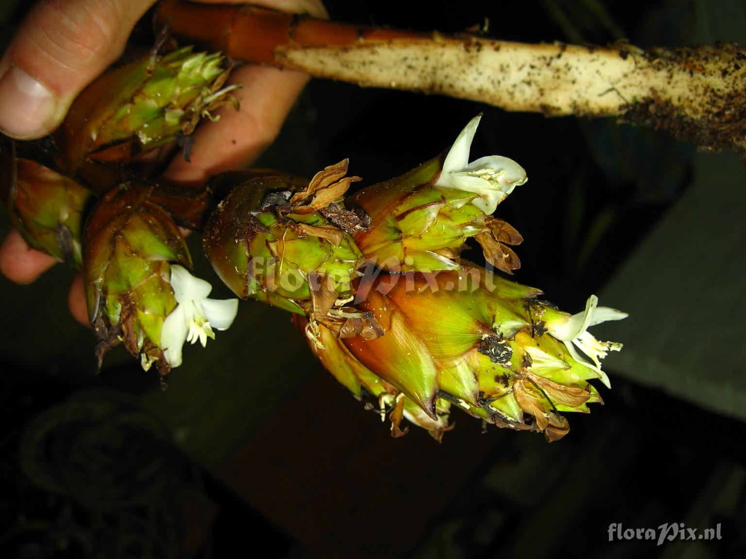 Locality: Ecuador - Prov. of Zamora-Chinchipe, area of Estación Cientifica San Francisco (S 03°58“, W 79°04“ ), road Loja-Zamora, ca. 35 km from Loja; moist montane forest Photographer: Florian Werner Note: Col.: Werner, F.A. 1824 (19-11-2005) - Det.: H. Luther (SEL) 2007 "or epiphytic close ground. leaves thick and stiff; bracts plain olive, petals large and white, opening at dusk."