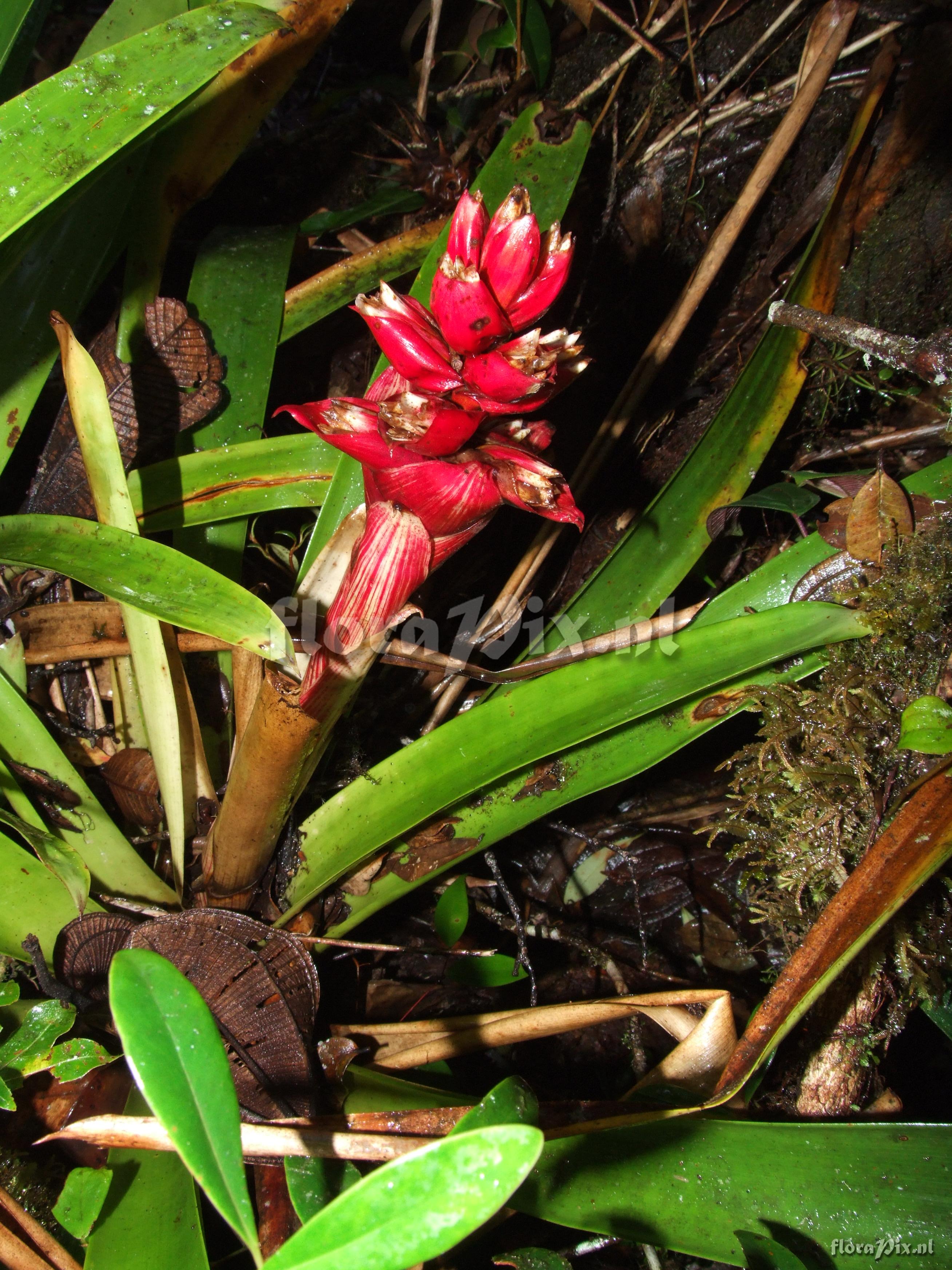 Locality: Ecuador - Prov. of Zamora-Chinchipe, area of Estación Cientifica San Francisco (S 03°58“, W 79°04“ ), road Loja-Zamora, ca. 35 km from Loja; moist montane forest Photographer: Florian Werner Note: Col.: Werner, F.A. 2058 (19-06-2006) - Det.: W. Till (U Vienna) 2011 "leaves fairly light green without markings; bracts bright pinkish red; flowering: petals white, slim tubular."