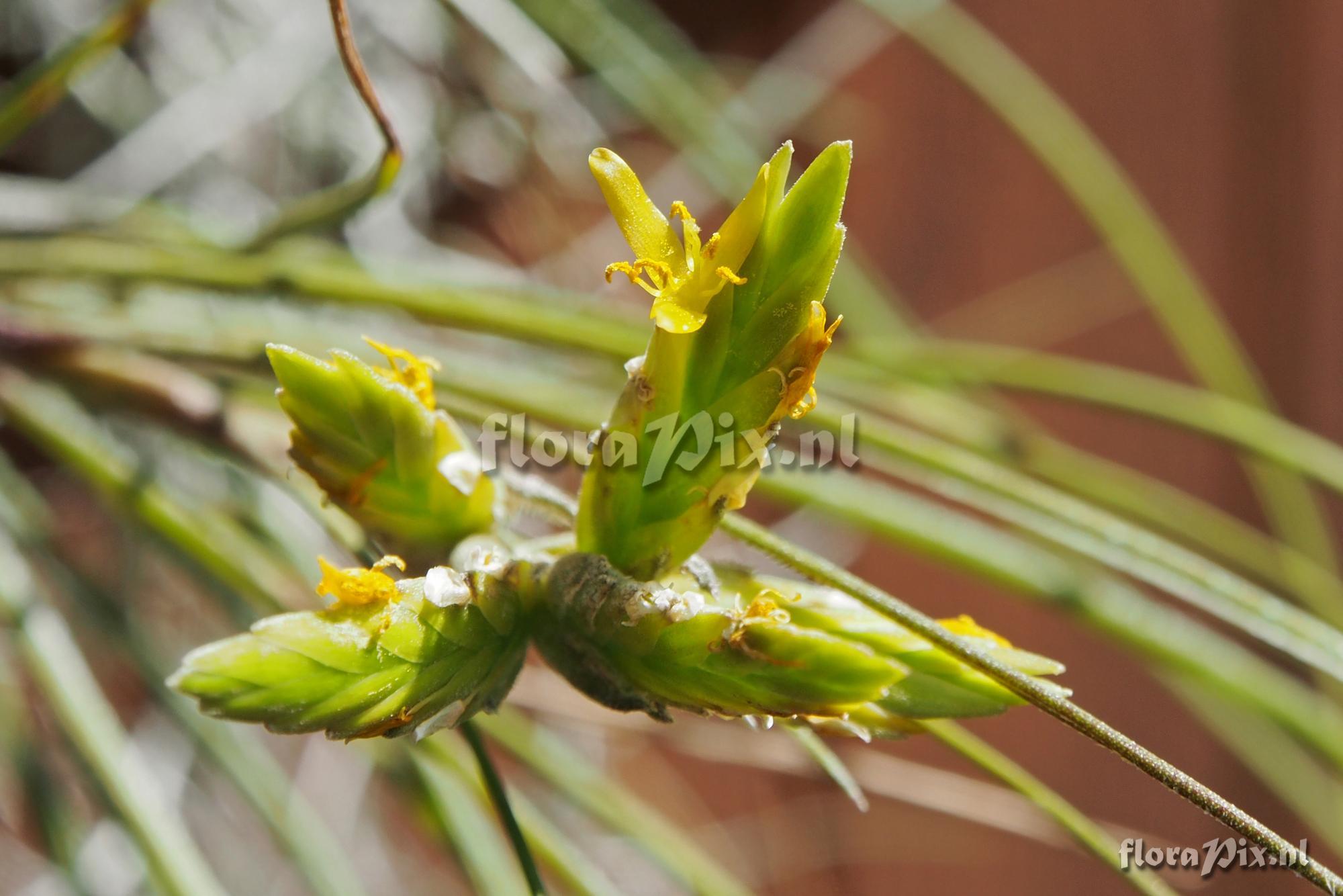 (Uploaded as: Racinaea species) Locality: Ecuador - Unknown - I purchased this from Gilberto Merino in 2017, and it just came into flower in my greenhouse. I need help identifying it. Leaves are 25 cm long (longest). Inflorescence 15 cm long, with 5 spikes clustered at the end. Each spike is 2.4 to 3.0 cm long and 6 mm wide. Flower bracts are 11 mm long. Petals (visible part) are 8 mm long and 2 mm wide. Any ideas? Large flowers for such a small Racinaea, or is it a Tillandsia? Photographer: Jerry Raack Identification: solved