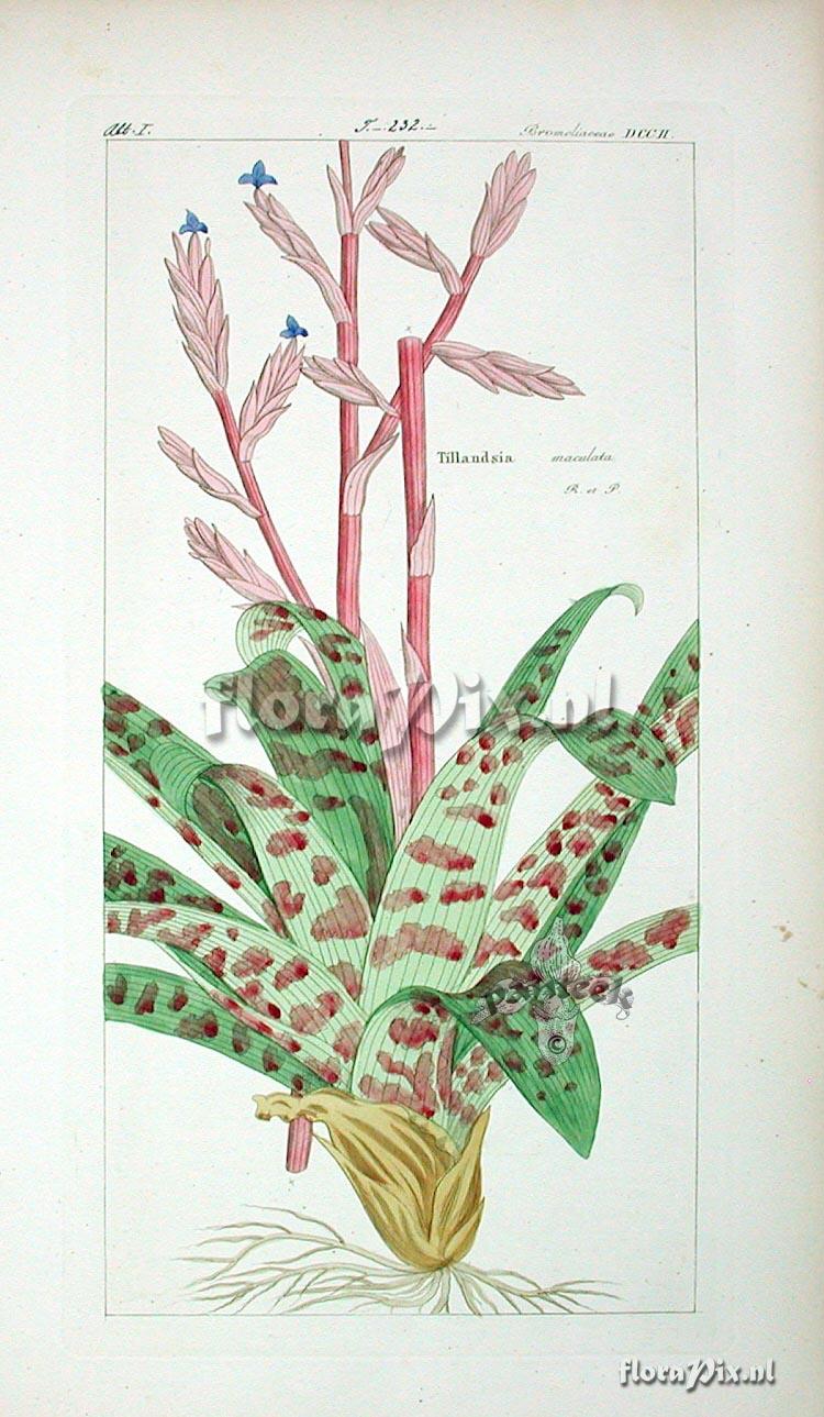 - Add Note (1861): Eric Gouda (2008-05-07) - We have seen many different looking plants that we are now calling T. cf. maculata or T. cf. tovarensis. I have added a picture here of a drawing of T.maculata, but never seen a maculate plant like that in Ecuador. In certain areas the young plants has pale green leaves with black leaf-sheaths and in other areas the inner leaves have some faint spotting. We find plant with long branches and short spikes and short branches with longer spikes. What is clear is that some more research has to be done here to see what the variation is and to distinguish both species (or maybe more).