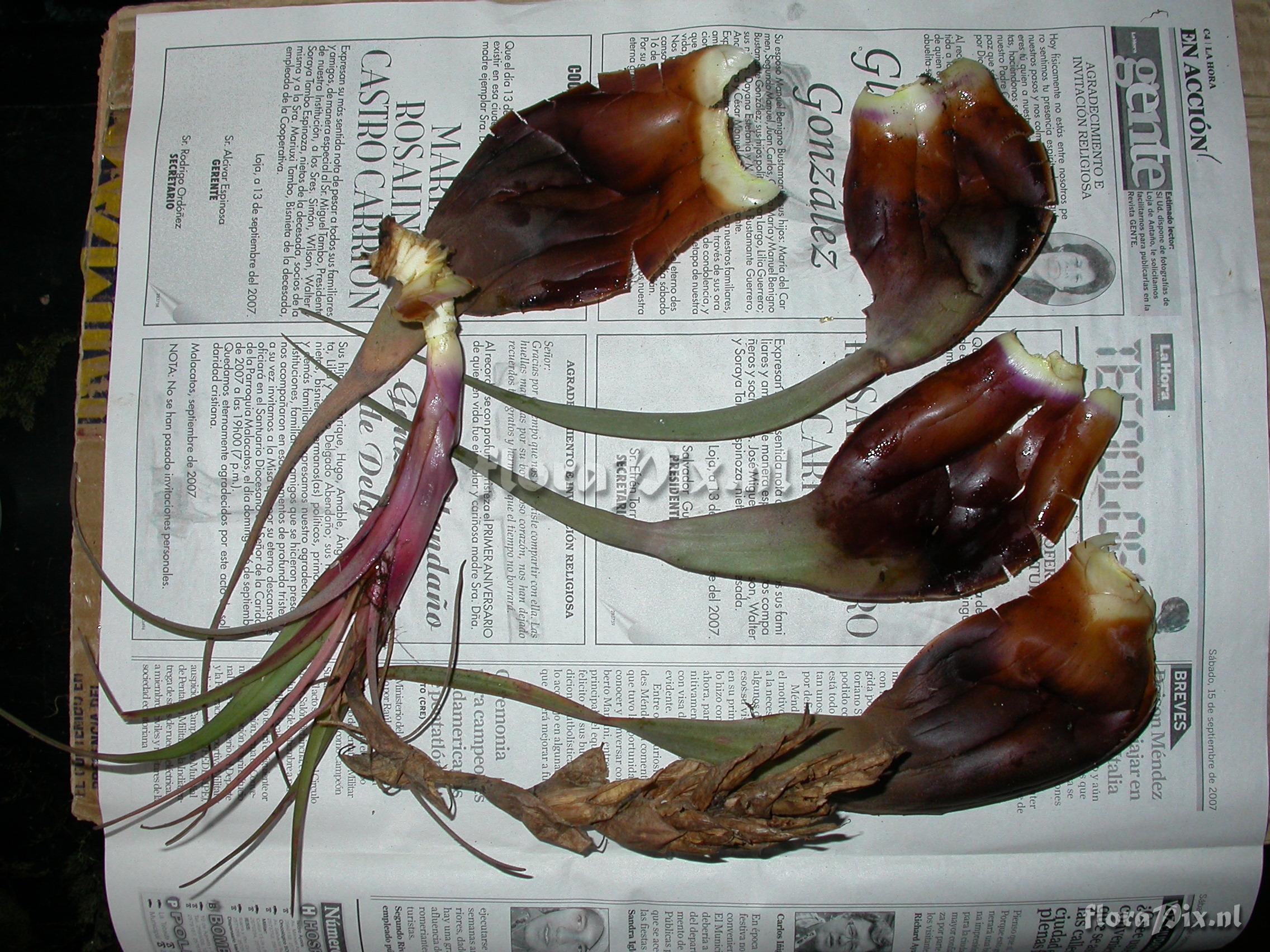 Locality: Ecuador - Prov. of Zamora-Chinchipe, area of Estación Cientifica San Francisco (S 03°58“, W 79°04“ ), road Loja-Zamora, ca. 35 km from Loja; moist montane forest Photographer: Florian Werner Note: (as Werner, F.A. 1962 ) - Det.: H. Luther (SEL) 2007 "greyish type; infl. pending: bracts bright light orange, petals apple-green. Leaves full of trichomes which adaxially in the basal (""tank"")-half are hairy and brown.; strong fibres in leaves."