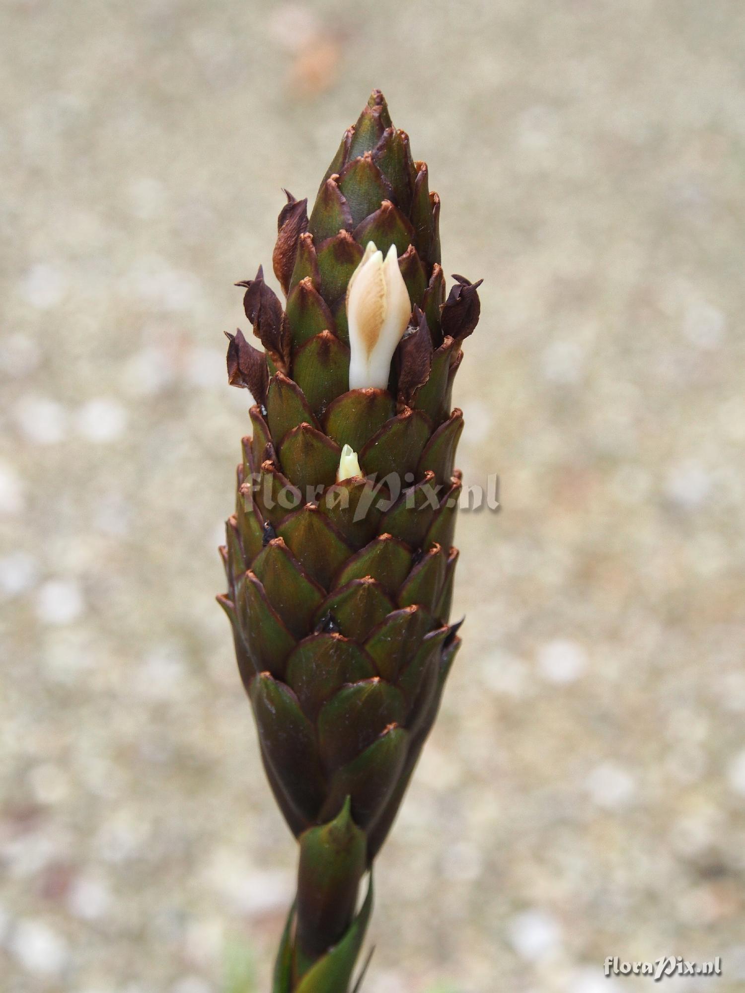 Locality: Ecuador - Unknown - I purchased this from Ecuagenera in Cuenca, Ecuador last year. They labeled it as Guzmania devansayana1, but of course it is not Guz devansayana, and unfortunately, I have no locale information. I can't identify it, can you? It is flowering now in my greenhouse in Ohio (USA). It measures 110cm high x 91cm across. The inflated portion of the inflorescence is 3.8cm wide and 13cm high. The leaves are 63cm long and 2.5cm wide (in the middle). It is a fragrant night-blooming plant and the flowers open from the top of the inflorescence downward.