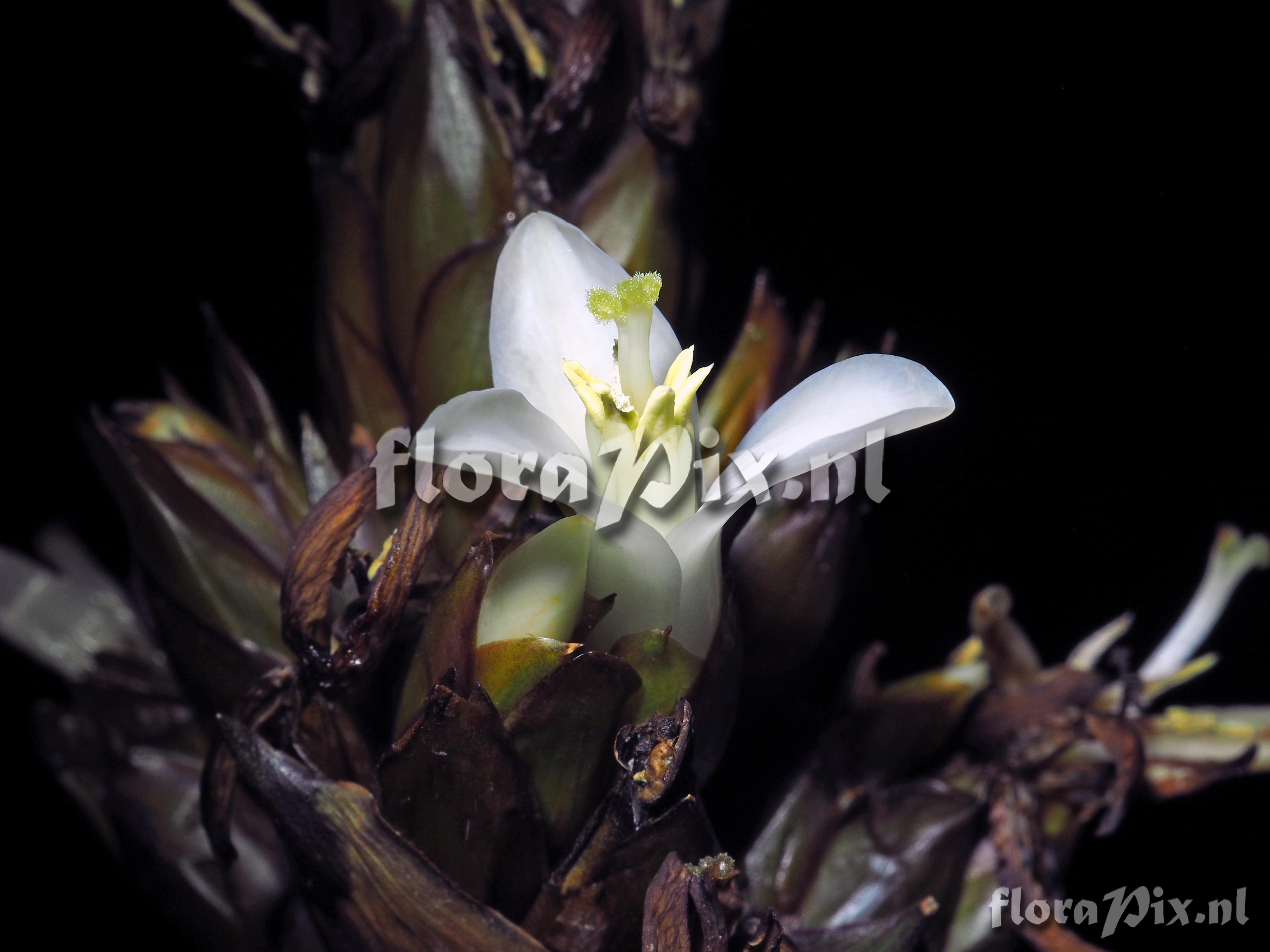 Locality: Ecuador - Morona Santiago - 7 km on road Macas to Cuenca from E45 at 2371 m Photographer: Jerry Raack Note: This is a NIGHT FLOWERING bromeliad; hence, the flowers do not fully open until about an hour after dark, and close up before daylight. The flowers have a slight fragrance when open. Probably pollinated by moths or night-flying insects of some type. Grows in very wet conditions in deep moss as a terrestrial or epiphyte low on the trees near the forest floor.