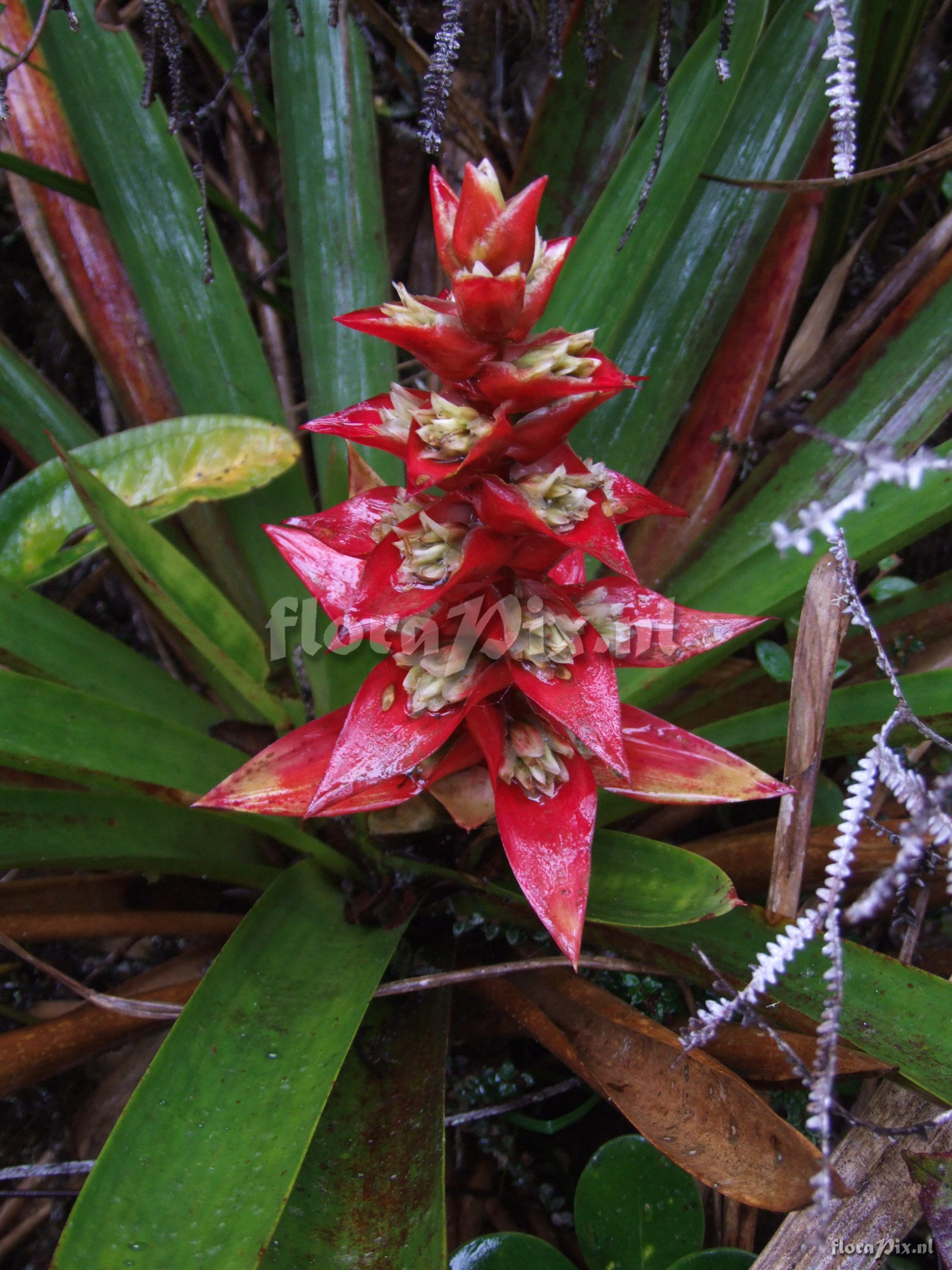 (Uploaded as: Guzmania ) Locality: Ecuador - Prov. of Zamora-Chinchipe, area of Estación Cientifica San Francisco (S 03°58“, W 79°04“ ), road Loja-Zamora, ca. 35 km from Loja; moist montane forest Photographer: Florian Werner Note: Col.: Werner, F.A. 1958 (23-04-2006) "common around 2500m; leaves thin and very brittle; bracts bright red, flowers white." Identification: pending