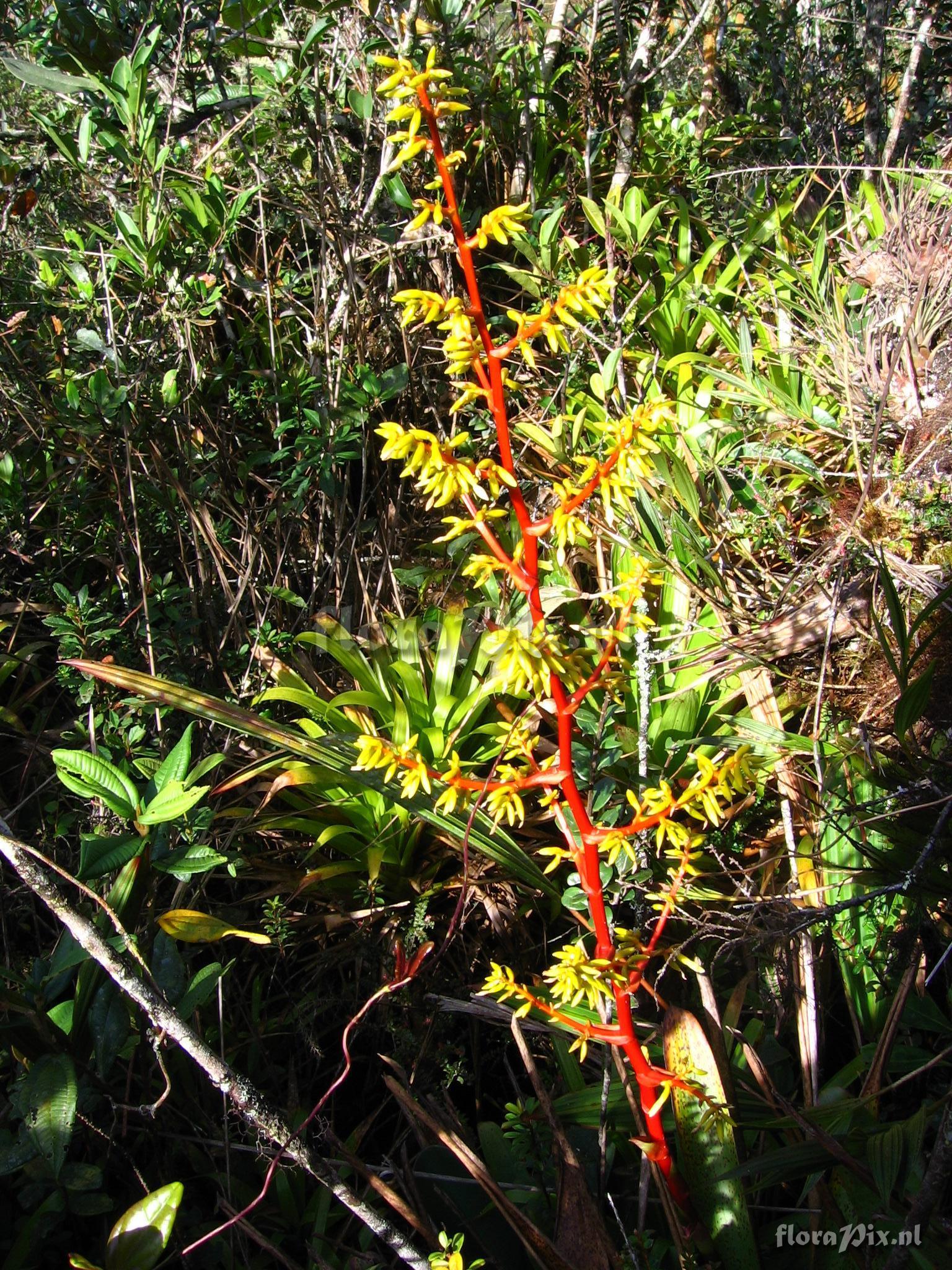 (Uploaded as: Guzmania pennellii L.B.Smith) Locality: Ecuador - Prov. of Zamora-Chinchipe, area of Estación Cientifica San Francisco (S 03°58“, W 79°04“ ), road Loja-Zamora, ca. 35 km from Loja; moist montane forest Photographer: Florian Werner Note: Col.: Werner, F.A. 1827 (19-11-2005) - Det.: H. Luther (SEL) 2009 "leaves with greyish shine, especially abaxially. Peduncle bright orange, ""calyx"" bright yellow, petals yellowish white. Leaves very soft" Identification: solved