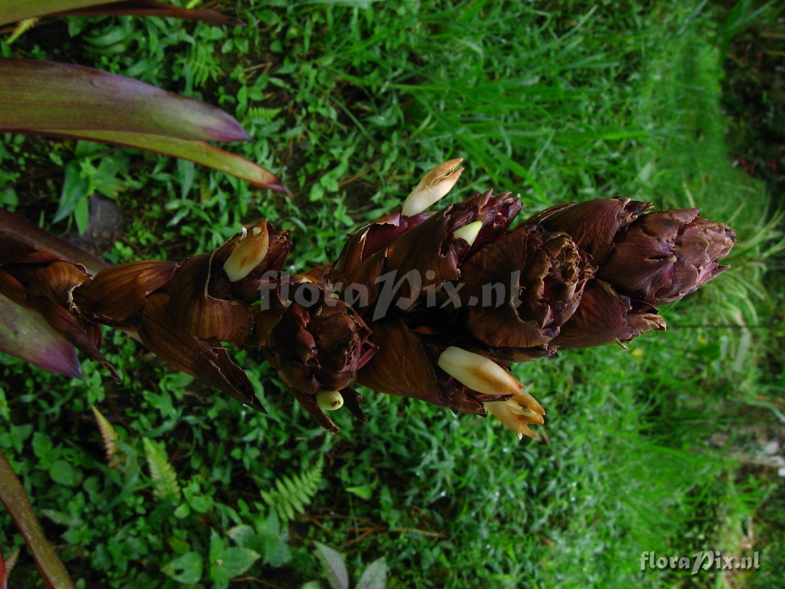 Locality: Ecuador - Prov. of Zamora-Chinchipe, area of Estación Cientifica San Francisco (S 03°58“, W 79°04“ ), road Loja-Zamora, ca. 35 km from Loja; moist montane forest Photographer: Florian Werner Note: Col.: Werner, F.A. 1997 (12-05-2006) - Det.: H. Luther (SEL) 2007 veins and crossveins of leaves bright red, giving a locally unique fine squared pattern. Uncommon. Petals wool-white, bracts essentially reddish-brown. Finally pressed (photos) 4.6.06.