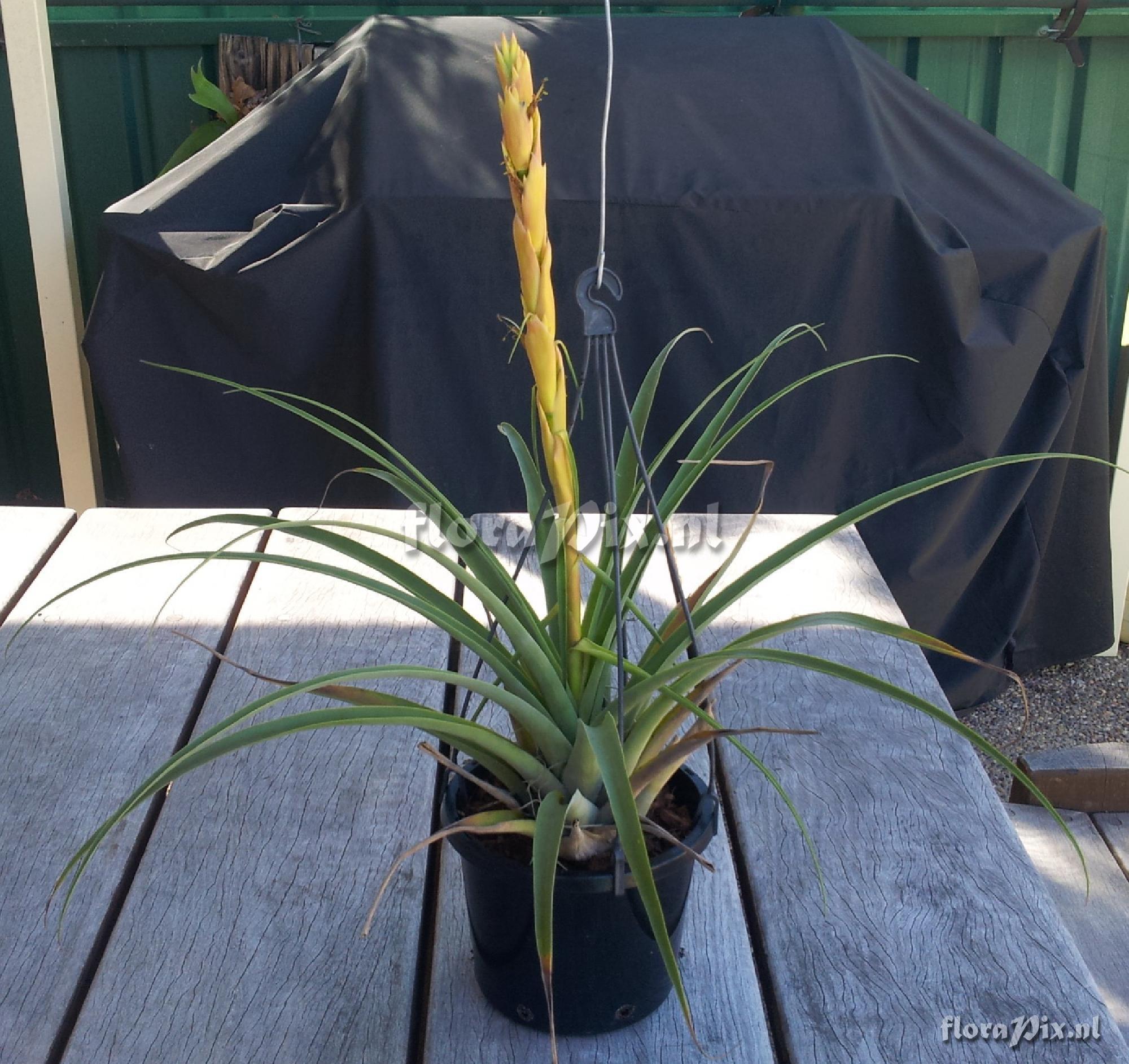 - Note (11345): Jerry Raack (2014-02-12) - Nice job posting the piece parts Peter. Who has done some study on this group of similar plants, does anyone know? When I compare pictures of this plant with what I posted and Eric identified as Tillandsia olmosana var pachamamae (Originally posted as Vriesia cylindrica), I'm hard pressed to see any significant differences other than color. Admittedly, I did not pull my inflorescence apart, but the closeup photos of the inflorescence and flowers sure look the same. I have another of my plants coming into bloom in a week or two, I'll pull it apart and do as you did with yours for comparison. Do you have some overall dimensions of your yellow form that you can post here (total height, width, length and width of leaves)? Does anyone in the USA have this plant and would like to trade me one for one of my T/V that I posted?