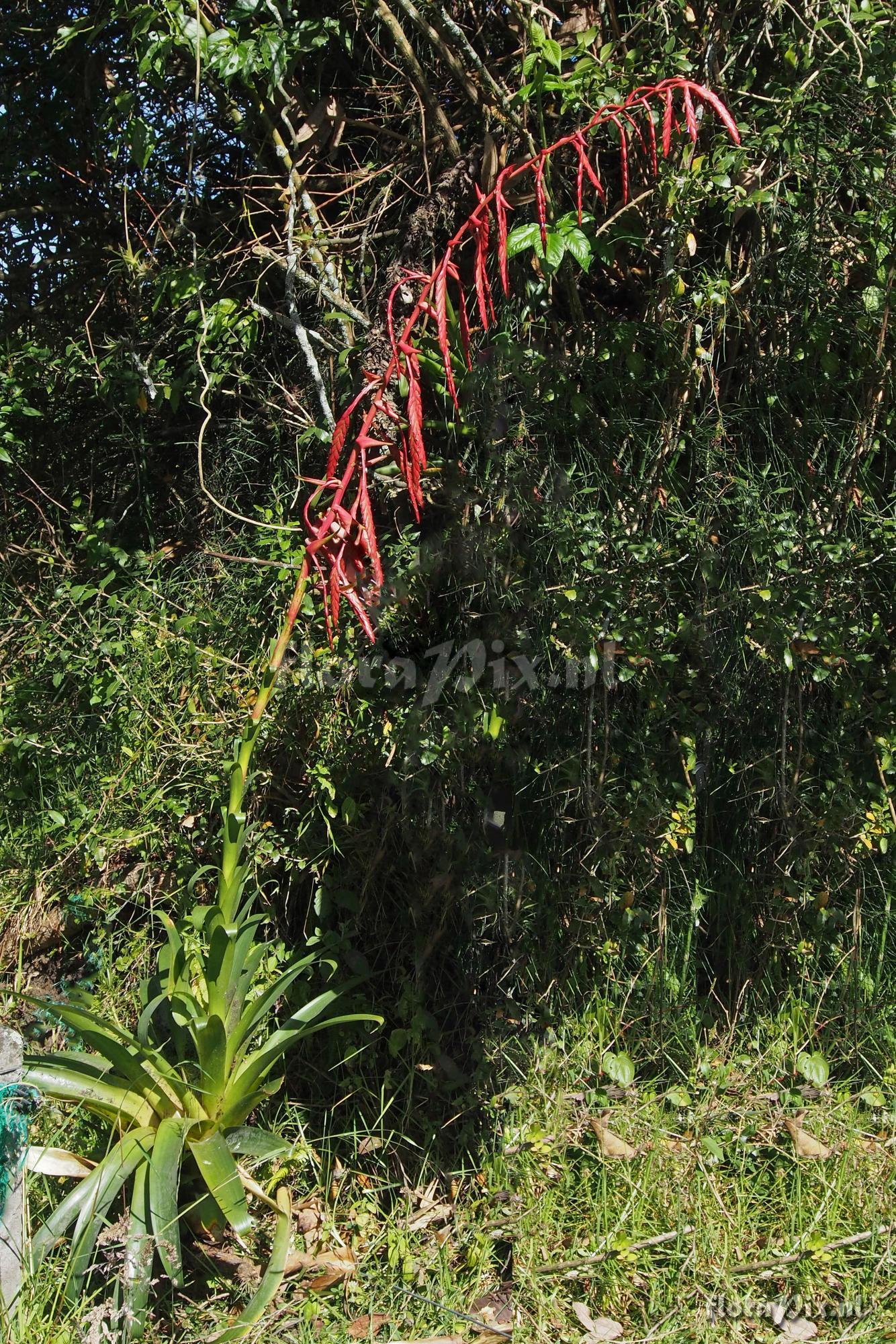 Locality: Ecuador, Azuay Province - The first two pictures are NOT from Azuay Province, but was seen on our June 2015 trip. I do not have a locale for this. The remainder of the pictures are from Azuay Province on a side road west from Portete at an elevation of 3067 meters. The first plant is definitely Tillandsia clavigera (Jose Manzanares, Eric and I were together when we saw it). The other plant is believed to be T. clavigera, but I would like confirmation. Photographer: Jerry Raack Note: This plant from Azuay is difficult to see due to all the other plant material around it. So, you'll have to piece together the pieces from the other pictures to see what it looks like. Very tall to 2 meters high. Note the offsets at the base of each spike in the inflorescence. There were also several offsets coming from within the leave axils (seen in the one photo of the foliage), as well as offsets from the base. A very unusual way of reproducing that I have not seen before. (Sent: brom-l@science.uu.nl) Identification: asked