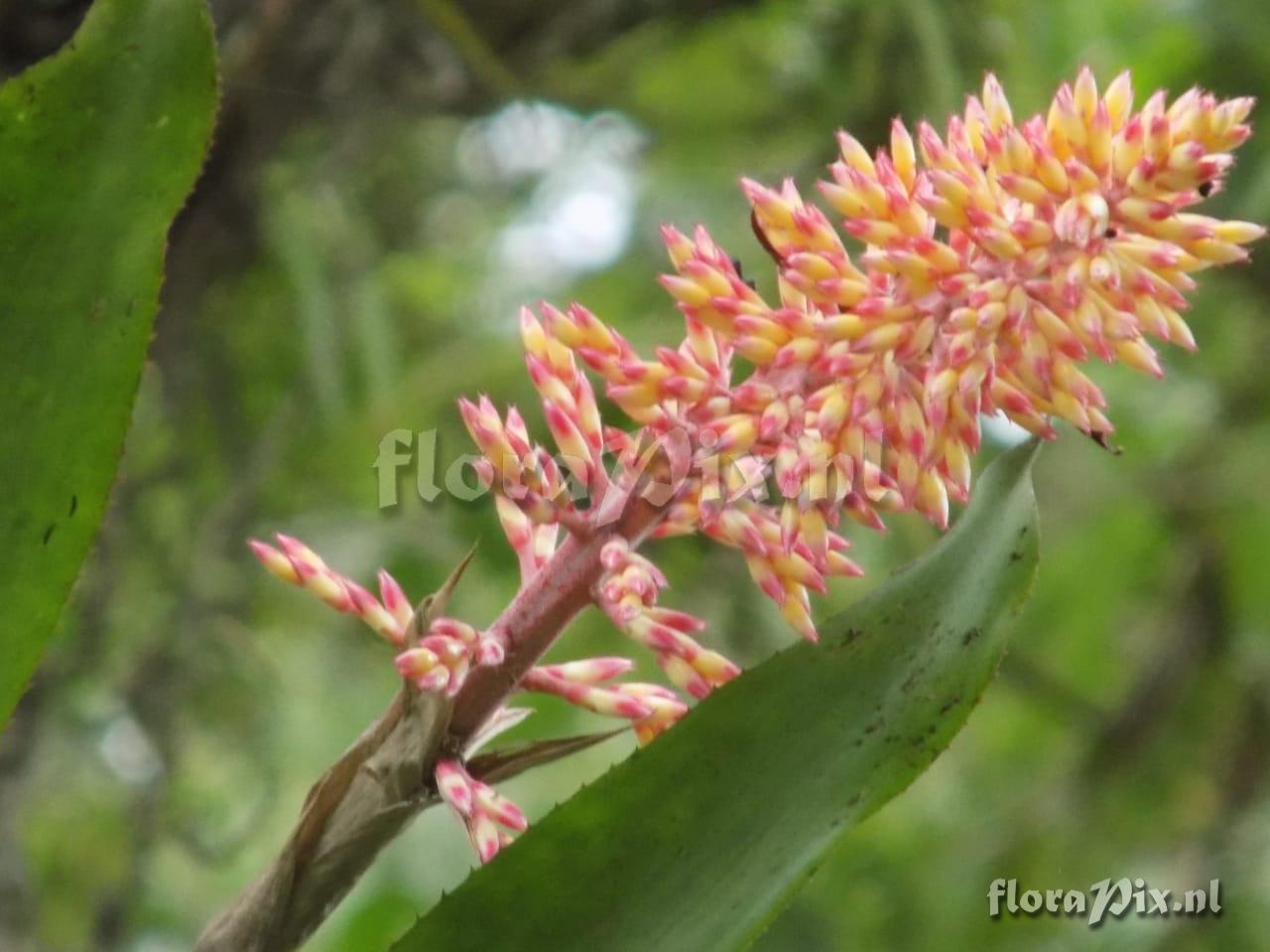 - Looks like a hybrid of Aechmea distichantha (Sent: brom-l@science.uu.nl) - Note (16113): Diego Benavides (2021-04-09) - Aechmea latifolia? I have some latifolias growing from seed, their flowers are in size different from their parents, but looks like this plants.