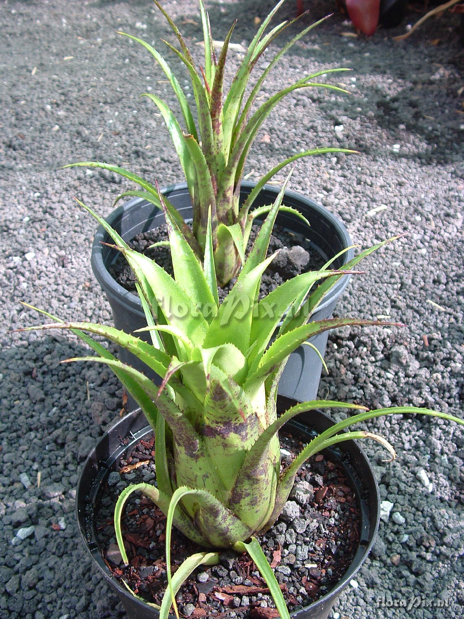 Patience! Wait for flowering. It appears to be a hybrid with one of the recurvata's and a dark leaved species. If it has a decent inflorescence and you see marketing potential then when the dust settles give it a Cultivar name and register it. (Verzonden: brom-l@science.uu.nl) - Opmerking: Andy Siekkinen (2011-09-26) - It isn't a A. recurvata var. benrathii? Too many spines for var. benrathii? (Verzonden: brom-l@science.uu.nl)