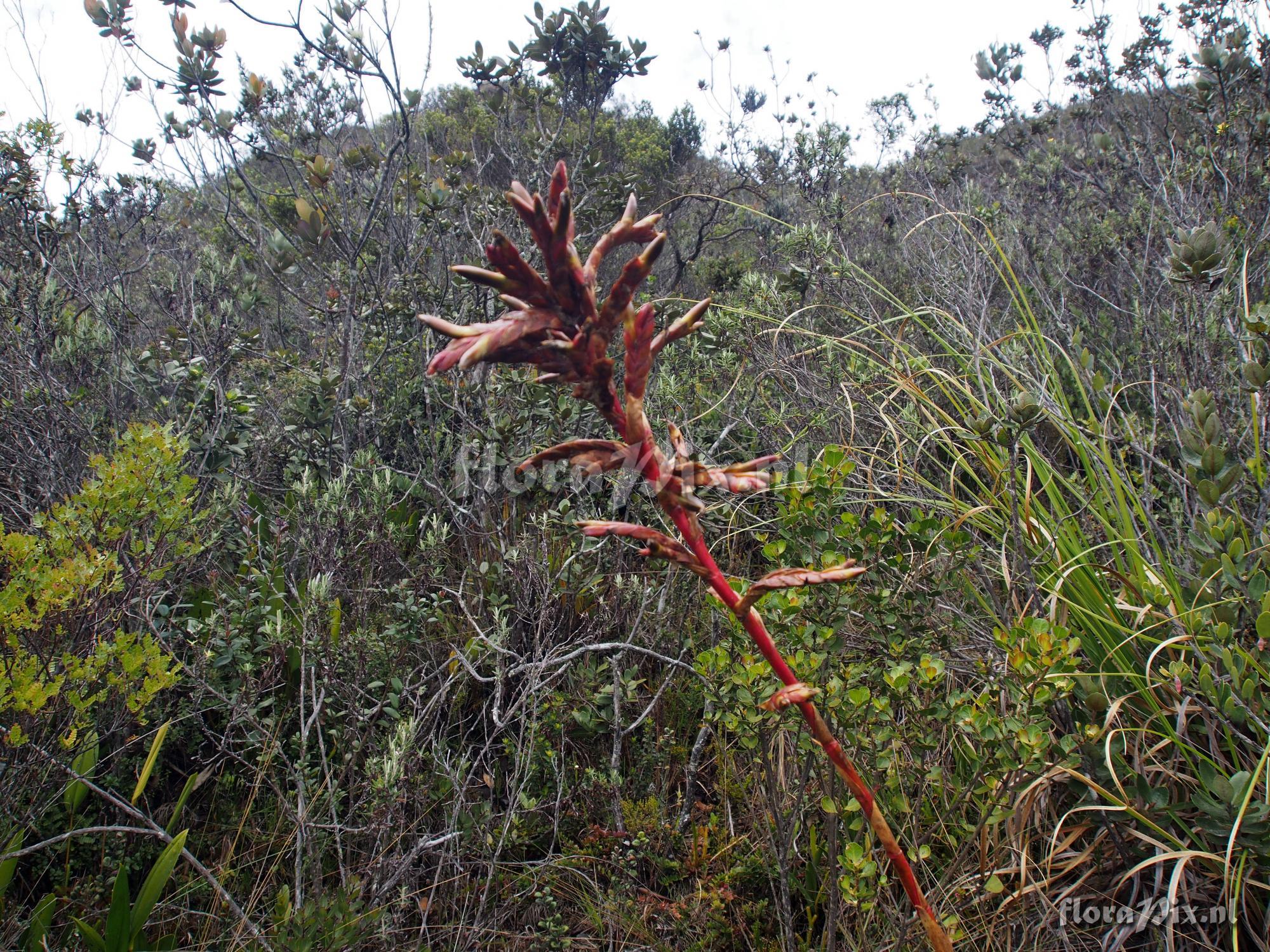 Verzamel locatie: Ecuador - S03 15' 46.45" W79 03' 31.19", Elevation 3065 meters. Growing in scrub trees (probably not original vegetation) terrestrially on the ground. Note the enlarge stem formed by offsets. Also growing in the same locale T. stenoura and T. walteri. Plants were approximately 135 to 140cm tall with inflorescence. Note the very colorful new young plant growing out in the open. Too bad they don't keep this attractive a foliage. Fotograaf: Jerry Raack Determinatie: in behandeling