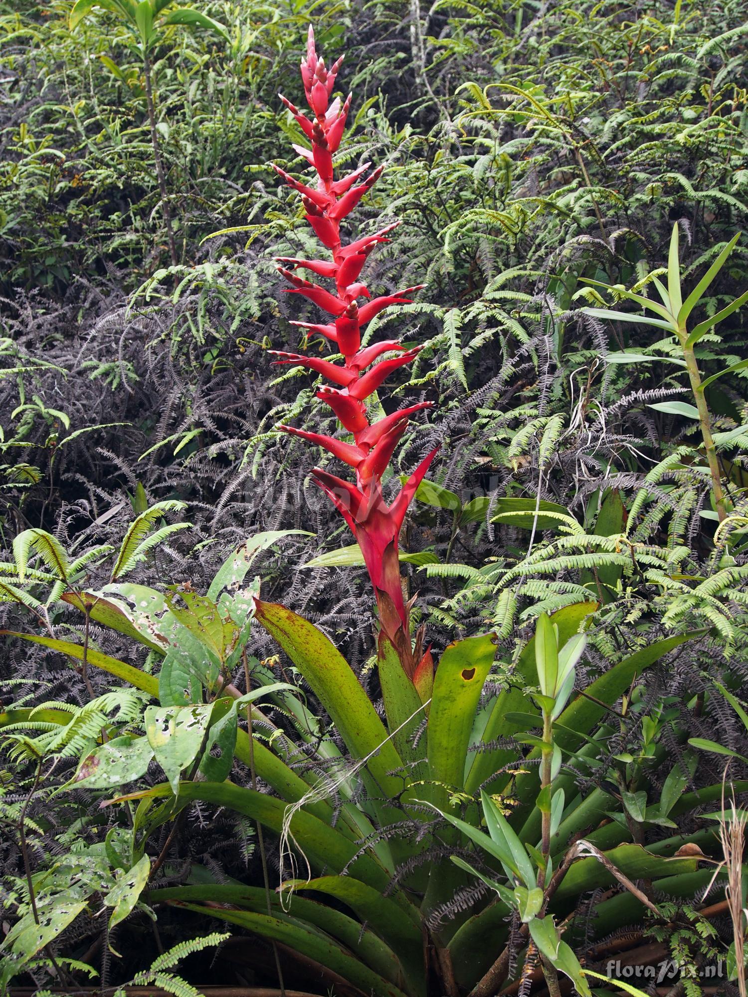 (Uploaded as: Vriesea (Mezobromelia) rubrobracteata) Locality: Ecuador, Zamora-Chinchipe Province - East on the road from Los Encuentros toward the Condor Mountains. Growing terrestrially amid dense ground-cover ferns and low on trees along the road. Also found on the road from El Pangue to Limon along road cuts. Elevation 1630 meters on both roads. Photographer: Jerry Raack Identification: solved