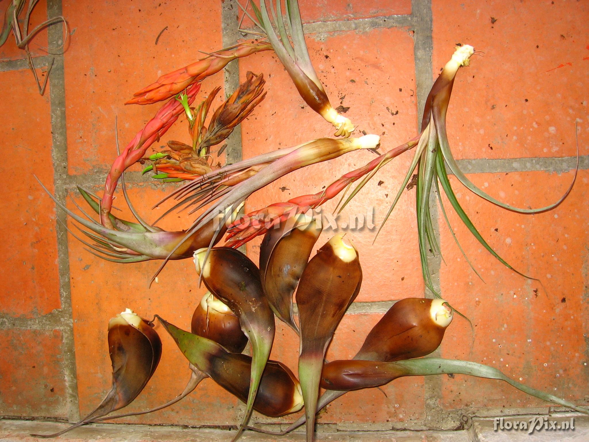 Locality: Ecuador - Prov. of Zamora-Chinchipe, area of Estación Cientifica San Francisco (S 03°58“, W 79°04“ ), road Loja-Zamora, ca. 35 km from Loja; moist montane forest Photographer: Florian Werner Note: Col.: Werner, F.A. 1962 (23-04-2006) - Det.: H. Luther (SEL) 2007 "greyish type; infl. pending: bracts bright light orange, petals apple-green. Leaves full of trichomes which adaxially in the basal (""tank"")-half are hairy and brown.; strong fibres in leaves."