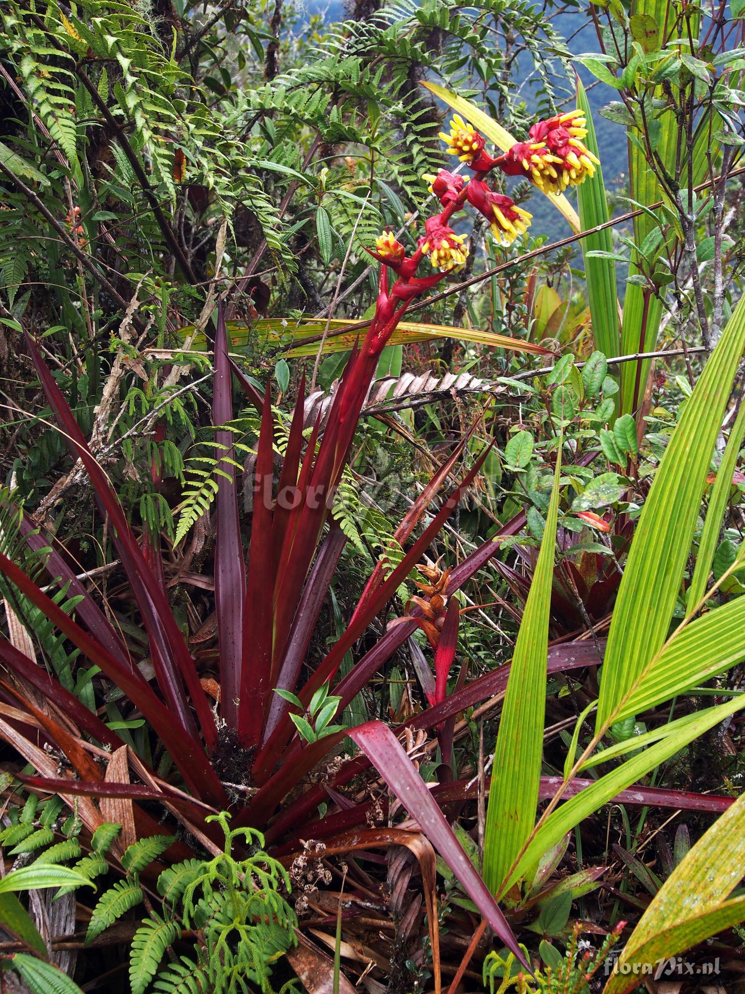13668 - Bromeliads (Wild) - 2018-03-08(Dimension: 1530 x 2050 pixels - Counter: 6973) Guzmania garciaensis ![]() Locality: Ecuador, Zamora-Chinchipe Province - 1st 3 pictures are from site on road from Los Encuentros heading east toward the Condor Mts in Zamora-Chinchipe Province at an altitude of 1632 meters. These plants were very large - I would say they were almost 1.25 meters tall. They were in full anthesis at the time of photographing them. They were growing terrestrially along the road cuts among the ever present deep creeping fern that covers these areas. Quite spectacular. This area did not appear to be overly wet. The 2nd 2 pictures (plant with red foliages are from a plant at a different location (Limon Antenna Road in Morona-Santiago Province growing at an altitude of 2284 meters. These plants at higher altitude were not fully open, so at the time were somewhat smaller, growing to about 1 meter high. Photographer: Jerry Raack Note: Higher elevation specimen.