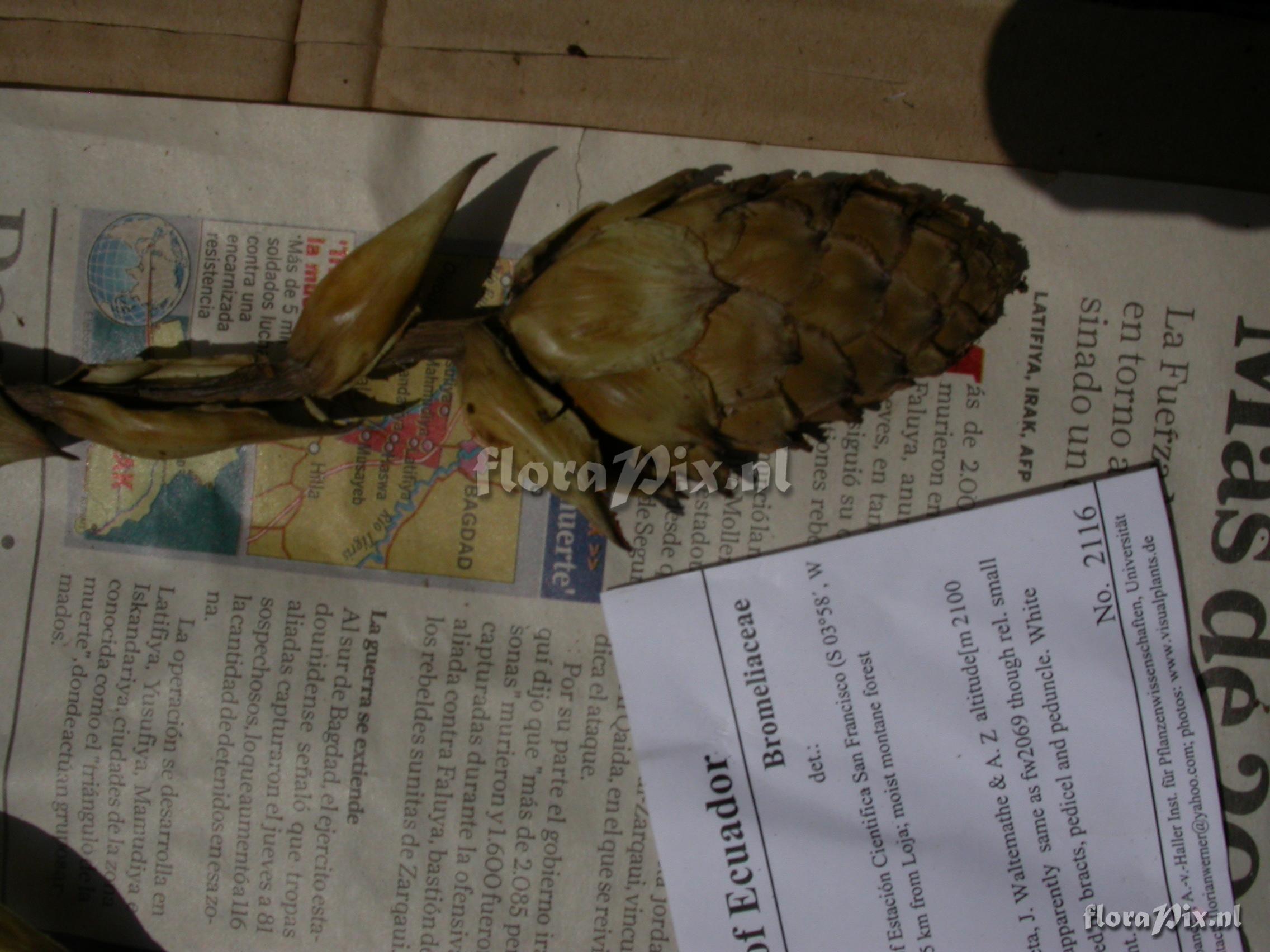 8104 - Bromeliads (Wild) - 2011-10-13(Dimension: 2302 x 1754 pixels - Counter: 8895) Guzmania atrocastanea H. Luther ![]() Locality: Ecuador - Prov. of Zamora-Chinchipe, area of Estación Cientifica San Francisco (S 03°58“, W 79°04“ ), road Loja-Zamora, ca. 35 km from Loja; moist montane forest Photographer: Florian Werner Note: Col.: Werner, F.A. 2116 (24-10-2006) - Det.: W. Till (U Vienna) 2011 apparently same as fw2069 though rel. small and with very little red on bracts, pedicel and peduncle. White flowers open at night.