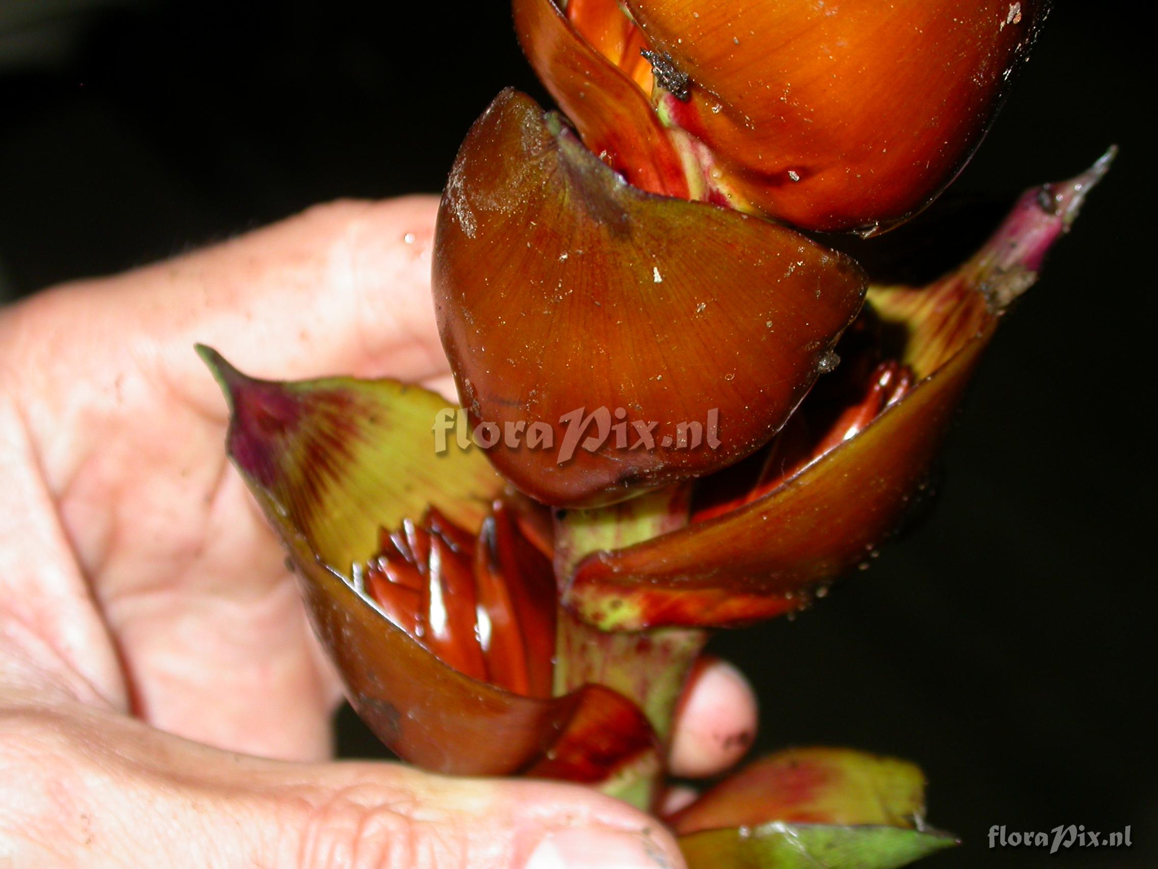 8985 - Bromeliads (Wild) - 2011-10-13(Dimension: 2302 x 1754 pixels - Counter: 9668) Guzmania xipholepis L.B. Sm. ![]() Locality: Ecuador - Prov. of Zamora-Chinchipe, area of Estación Cientifica San Francisco (S 03°58“, W 79°04“ ), road Loja-Zamora, ca. 35 km from Loja; moist montane forest Photographer: Florian Werner Note: Col.: Werner, F.A. 3058 (20-04-2010) inf. erect, large, with globose bracts subduing every parial infl. Leaves with very broaf base, tapering off ver gradually (but tip rounded).