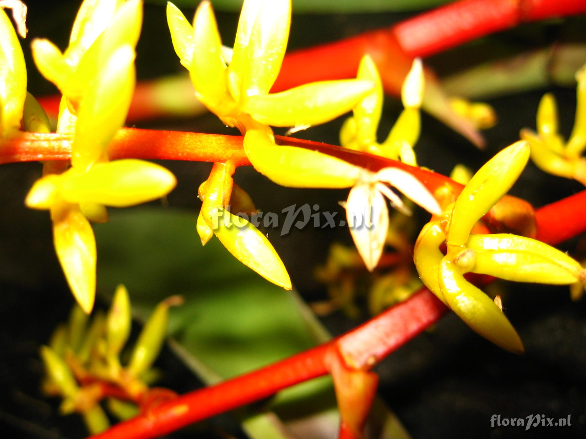 9333 - Bromeliads (Wild) - 2011-10-13(Dimension: 2078 x 1586 pixels - Counter: 10503) Guzmania difusa ![]() (Uploaded as: Guzmania pennellii L.B.Smith) Locality: Ecuador - Prov. of Zamora-Chinchipe, area of Estación Cientifica San Francisco (S 03°58“, W 79°04“ ), road Loja-Zamora, ca. 35 km from Loja; moist montane forest Photographer: Florian Werner Note: Col.: Werner, F.A. 1827 (19-11-2005) - Det.: H. Luther (SEL) 2009 "leaves with greyish shine, especially abaxially. Peduncle bright orange, ""calyx"" bright yellow, petals yellowish white. Leaves very soft" Identification: Solved