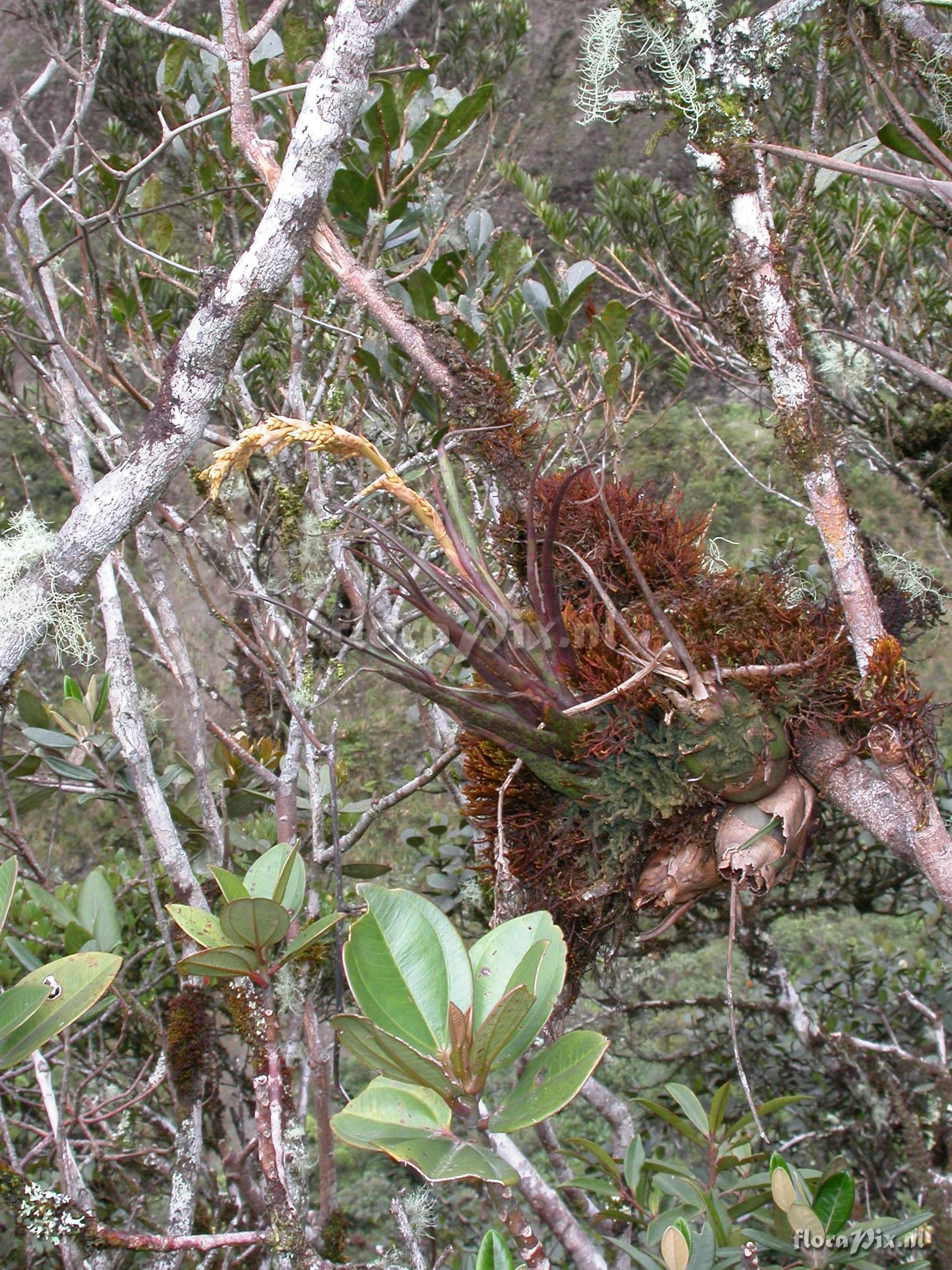 8425 - Bromeliads (Wild) - 2011-10-13(Dimension: 1734 x 2322 pixels - Counter: 6511) Racinaea euryelytra J.R. Grant ![]() Locality: Ecuador - Zamora-Chinchipe Province; few km east of Pass (""El Tiro"") between Loja and Zamora; very open, windswept and stunted ridge forest. Photographer: Florian Werner Note: Col.: Werner, F.A. 2216 (27-04-2007) - Det.: H. Luther (SEL) 2008 "growing upright; leaf tips touch infl. (i.e., conical gestalt). Ja genau, alles Gute zum Geburtstag!"