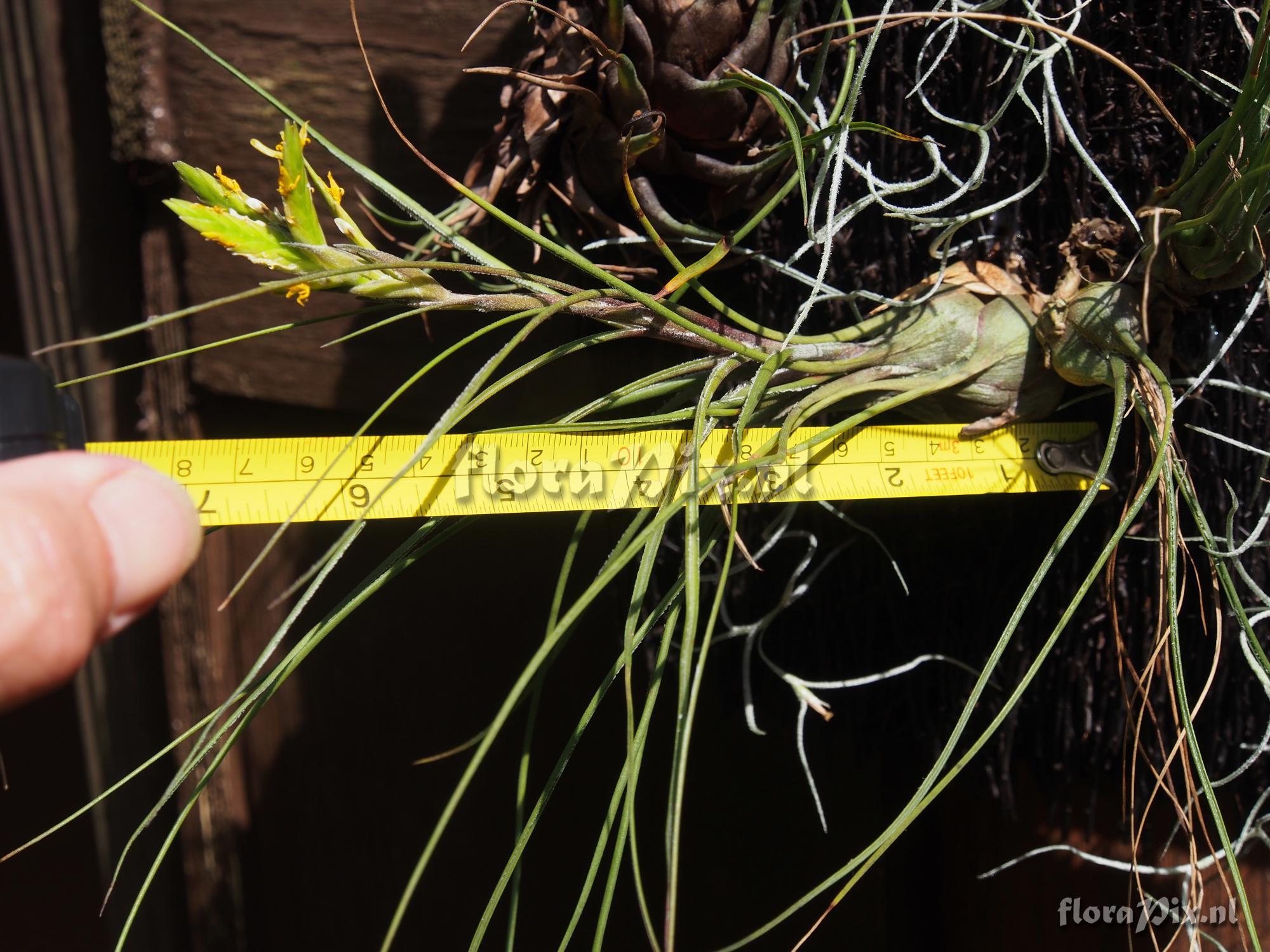 15322 - Bromeliads (Garden) - 2018-07-04(Dimension: 2030 x 1550 pixels - Counter: 6711) Tillandsia disticha ![]() (Uploaded as: Racinaea species) Locality: Ecuador - Unknown - I purchased this from Gilberto Merino in 2017, and it just came into flower in my greenhouse. I need help identifying it. Leaves are 25 cm long (longest). Inflorescence 15 cm long, with 5 spikes clustered at the end. Each spike is 2.4 to 3.0 cm long and 6 mm wide. Flower bracts are 11 mm long. Petals (visible part) are 8 mm long and 2 mm wide. Any ideas? Large flowers for such a small Racinaea, or is it a Tillandsia? Photographer: Jerry Raack Identification: Solved
