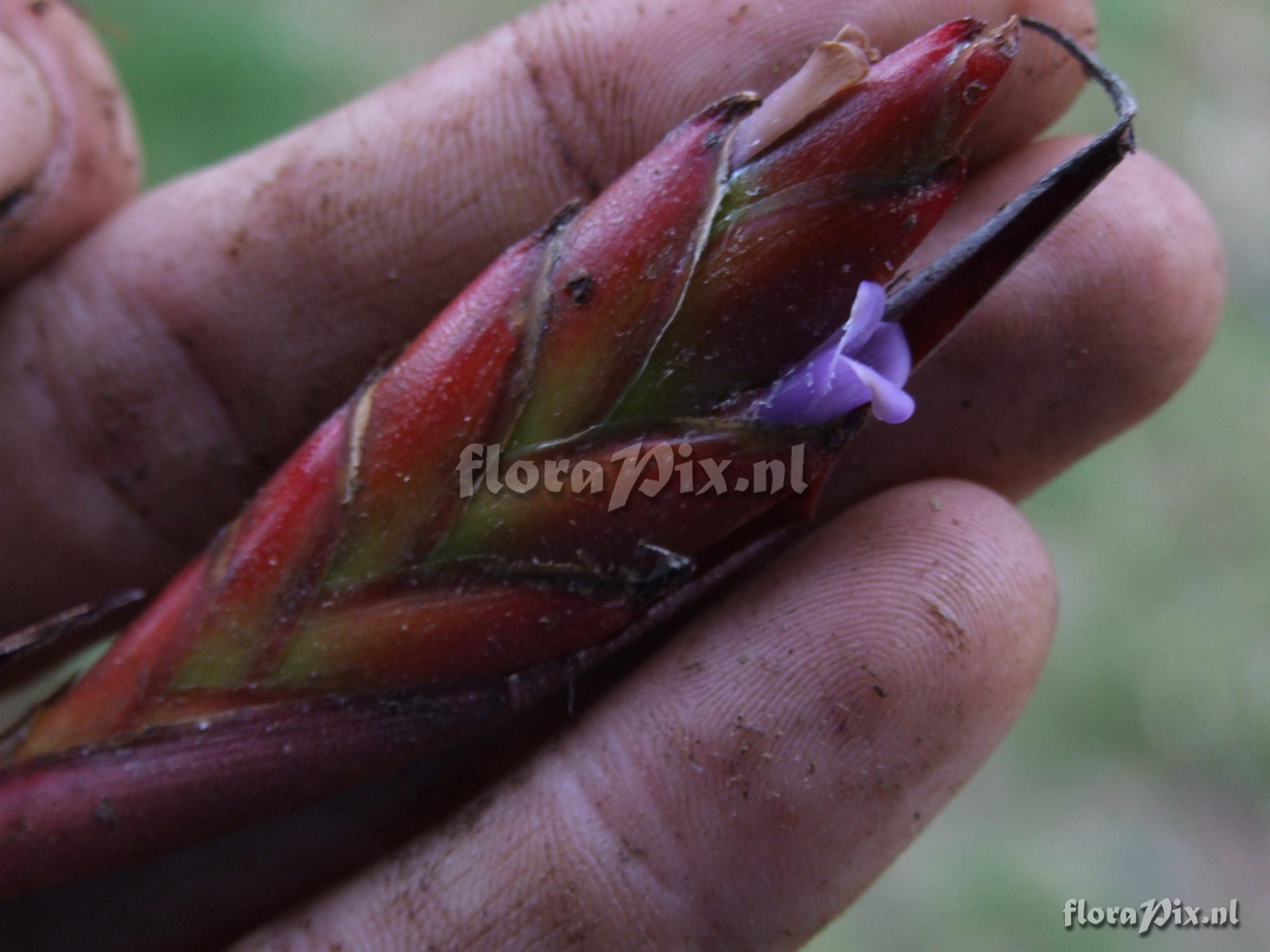 7748 - Bromeliads (Wild) - 2011-10-13(Dimension: 2078 x 1586 pixels - Counter: 14462) Tillandsia cf. ![]() Locality: Ecuador - Prov. of Zamora-Chinchipe, area of Estación Cientifica San Francisco (S 03°58´, W 79°04´ ), road Loja-Zamora, ca. 35 km from Loja; moist montane forest Photographer: Florian Werner Note: Col.: Werner, F.A. 1961 (23-04-2006) "uncommon but forming large clones with ind.s pointing toward any direction; leaves with consp. densely set trichomes abaxially; pointed leaves arranged vase-shaped; erect infl. red, petals mild lila."