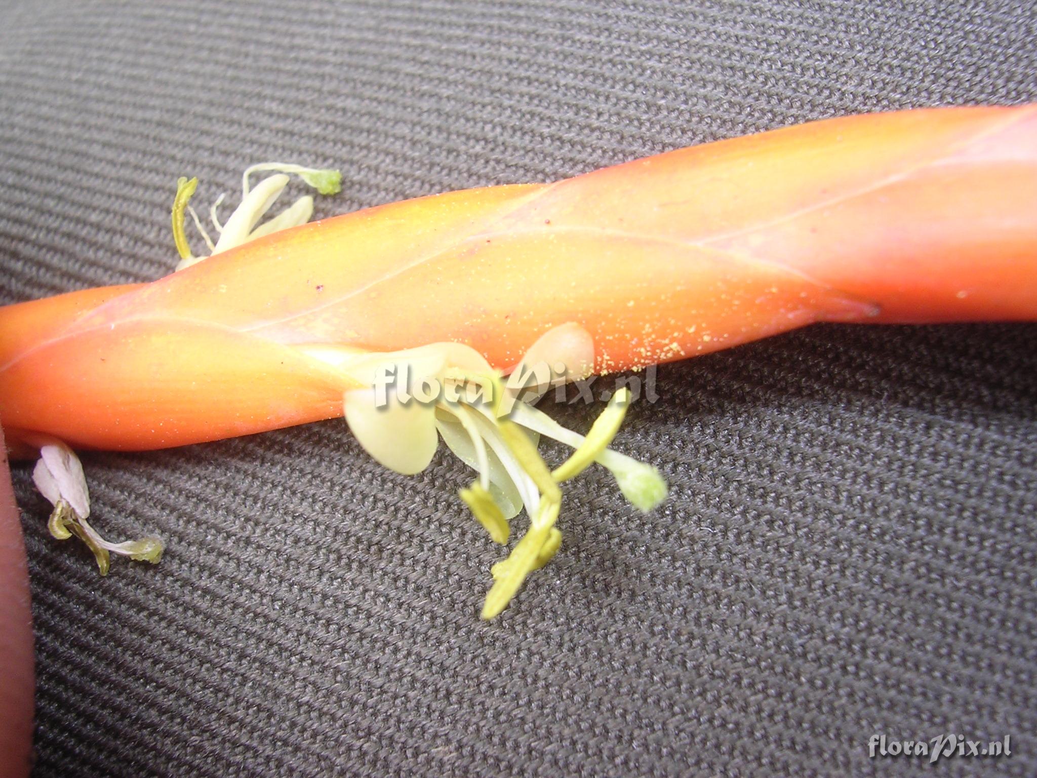 8546 - Bromeliads (Wild) - 2011-10-13(Dimension: 2078 x 1586 pixels - Counter: 9940) Tillandsia barthlottii Rauh ![]() Locality: Ecuador - Prov. of Zamora-Chinchipe, area of Estación Cientifica San Francisco (S 03°58´, W 79°04´ ), road Loja-Zamora, ca. 35 km from Loja; moist montane forest Photographer: Florian Werner Note: Col.: Werner, F.A. 1688 (17-07-2005) - Det.: J.M.Manzanares flower bracts bright orange, tepals and filaments wool-white.