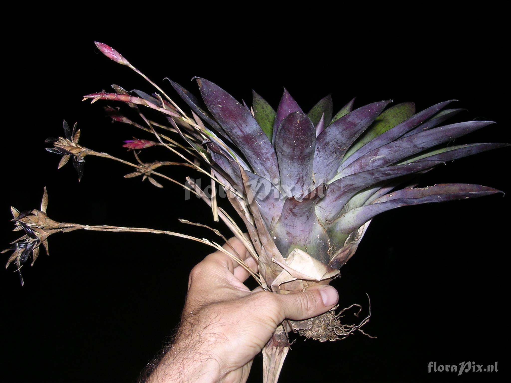 9265 - Bromeliads (Wild) - 2011-10-13(Dimension: 2078 x 1586 pixels - Counter: 12100) Tillandsia complanata Benth. ssp. complanata Gilmartin ![]() Locality: Ecuador - Prov. of Zamora-Chinchipe, area of Estación Cientifica San Francisco (S 03°58´, W 79°04´ ), road Loja-Zamora, ca. 35 km from Loja; moist montane forest Photographer: Florian Werner Note: Col.: Werner, F.A. 748 (10-01-2004) - Det.: F.A. Werner "acute, straight (uncurved) leaf tips; leaves usually conspicuously waxy & purplish below with pale yellowish green basal third, dirtyish green above, often with fine pirple spotting. Max. size distinctively smaller than classic T. complanata type; flowers lila to reddish-violet."