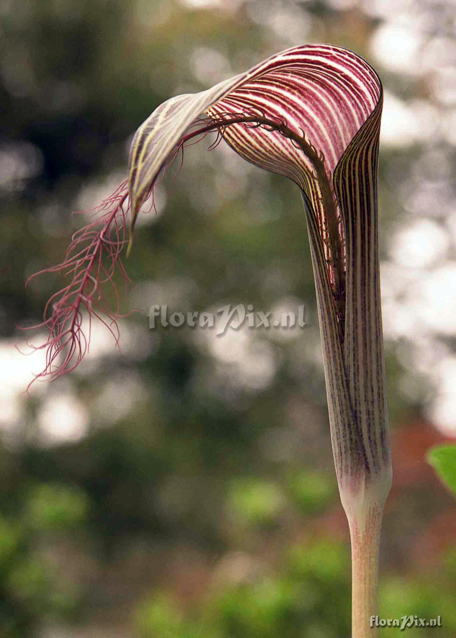 Note: Close-up of the inflorescence, showing the striped spathe and the spadix appendage fimbriate from top to base. Origin: Malaysia