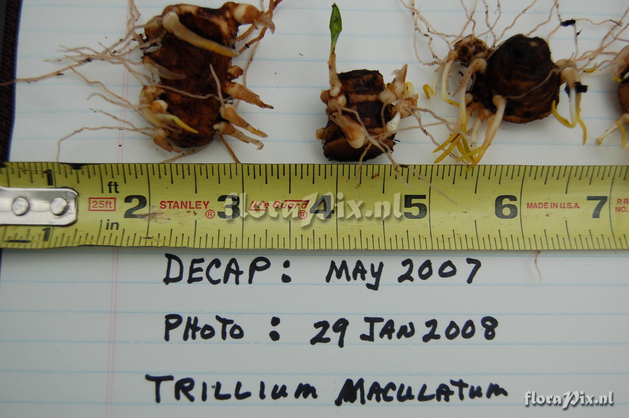 1971 - Woodland (Garden) - 2008-01-30(Dimension: 2030 x 1380 pixels - Counter: 5044) Trillium maculatum offsets ![]() Photographer: Harold Holmes Note: Trillium Maculatum rhizomes were decapitated in May 2007. Rhizome on left was sliced long ways after being decapitated. rhizome on the right was smaller and was not sliced long ways after decapitation. Both had a significant number (11-12)of offsets in 9 months.
