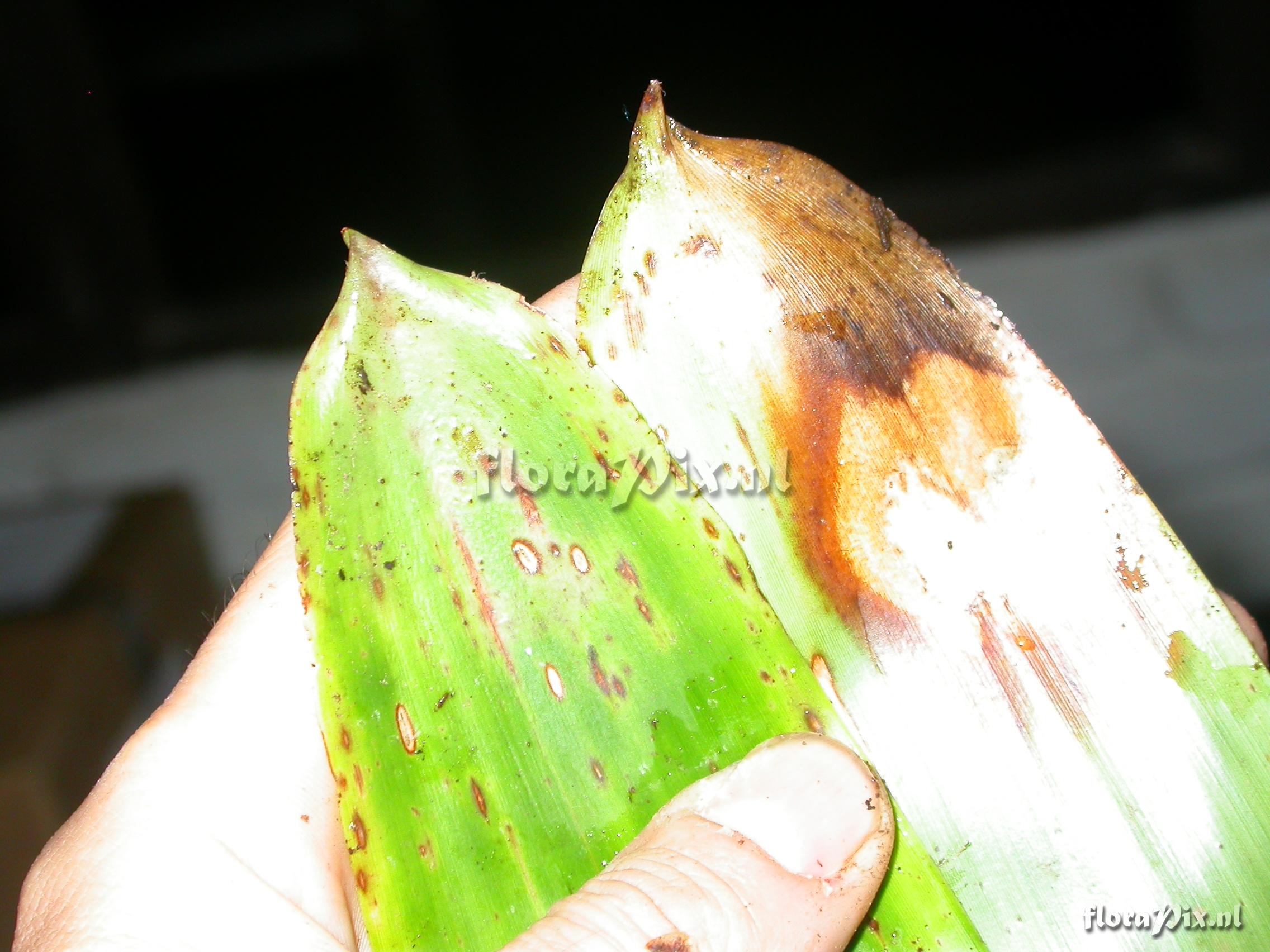 8982 - Bromeliads (Wild) - 2011-10-13(Dimension: 2302 x 1754 pixels - Counter: 9663) Guzmania xipholepis L.B. Sm. ![]() Locality: Ecuador - Prov. of Zamora-Chinchipe, area of Estación Cientifica San Francisco (S 03°58“, W 79°04“ ), road Loja-Zamora, ca. 35 km from Loja; moist montane forest Photographer: Florian Werner Note: Col.: Werner, F.A. 3058 (20-04-2010) inf. erect, large, with globose bracts subduing every parial infl. Leaves with very broaf base, tapering off ver gradually (but tip rounded).