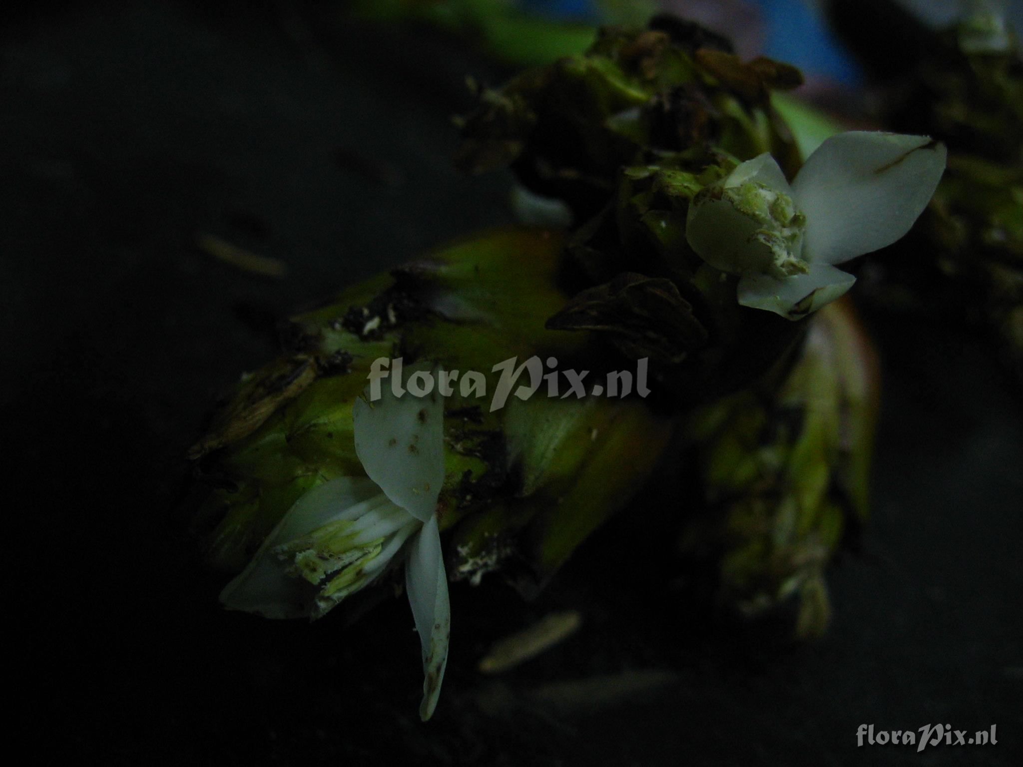 9328 - Bromeliads (Wild) - 2011-10-13(Dimension: 2078 x 1586 pixels - Counter: 9065) Guzmania atrocastanea H. Luther ![]() Locality: Ecuador - Prov. of Zamora-Chinchipe, area of Estación Cientifica San Francisco (S 03°58“, W 79°04“ ), road Loja-Zamora, ca. 35 km from Loja; moist montane forest Photographer: Florian Werner Note: Col.: Werner, F.A. 1824 (19-11-2005) - Det.: H. Luther (SEL) 2007 "or epiphytic close ground. leaves thick and stiff; bracts plain olive, petals large and white, opening at dusk."