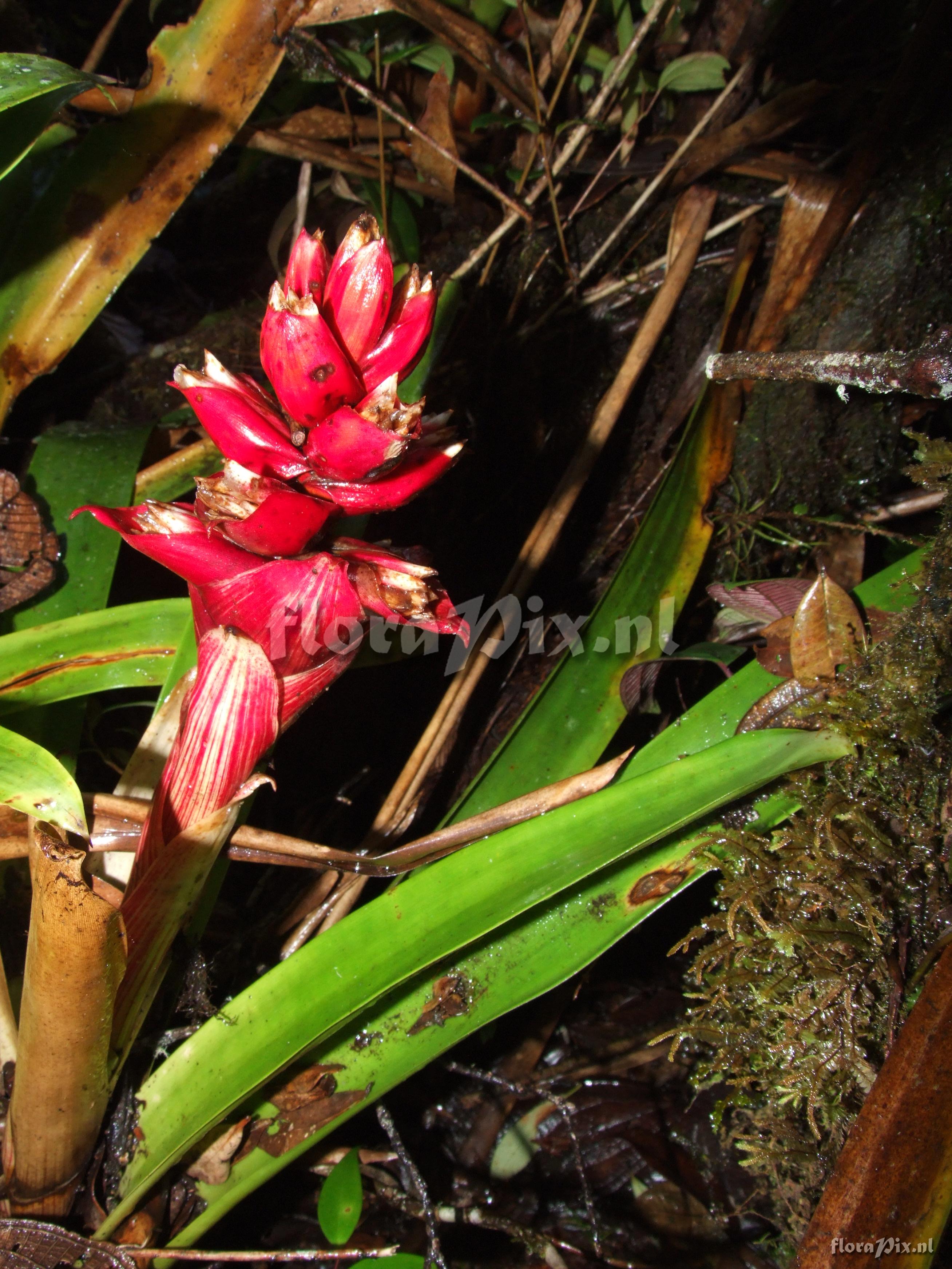 7824 - Bromeliads (Wild) - 2011-10-13(Dimension: 2646 x 3538 pixels - Counter: 8748) Mezobromelia cf. capituligera ![]() Locality: Ecuador - Prov. of Zamora-Chinchipe, area of Estación Cientifica San Francisco (S 03°58“, W 79°04“ ), road Loja-Zamora, ca. 35 km from Loja; moist montane forest Photographer: Florian Werner Note: Col.: Werner, F.A. 2058 (19-06-2006) - Det.: W. Till (U Vienna) 2011 "leaves fairly light green without markings; bracts bright pinkish red; flowering: petals white, slim tubular."
