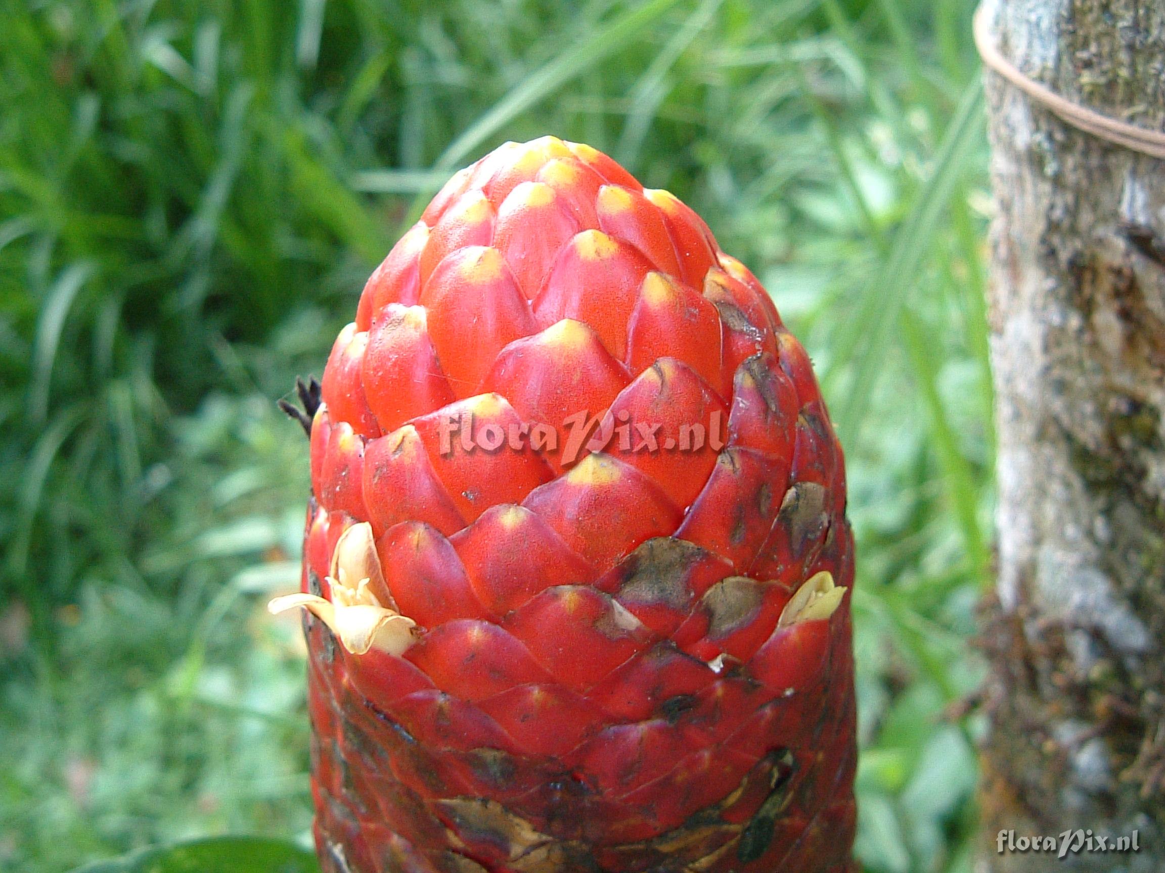 (Geladen als: Guzmania ) Verzamel locatie: Ecuador - Prov. of Zamora-Chinchipe, area of Estación Cientifica San Francisco (S 03°58“, W 79°04“ ), road Loja-Zamora, ca. 35 km from Loja; moist montane forest Fotograaf: Florian Werner Opmerking: Col.: Werner, F.A. 1782 (20-09-2005) "bracts along stalk (incl. those embracing the infl.) dirty purple or - simply - green (just as abaxial young leaves), bracts subduing flowers light red with yellow tips. Petals fleshy, wool-white; uncommon. Common (and larger) around 1000m, Bombuscaro." Determinatie: Opgelost