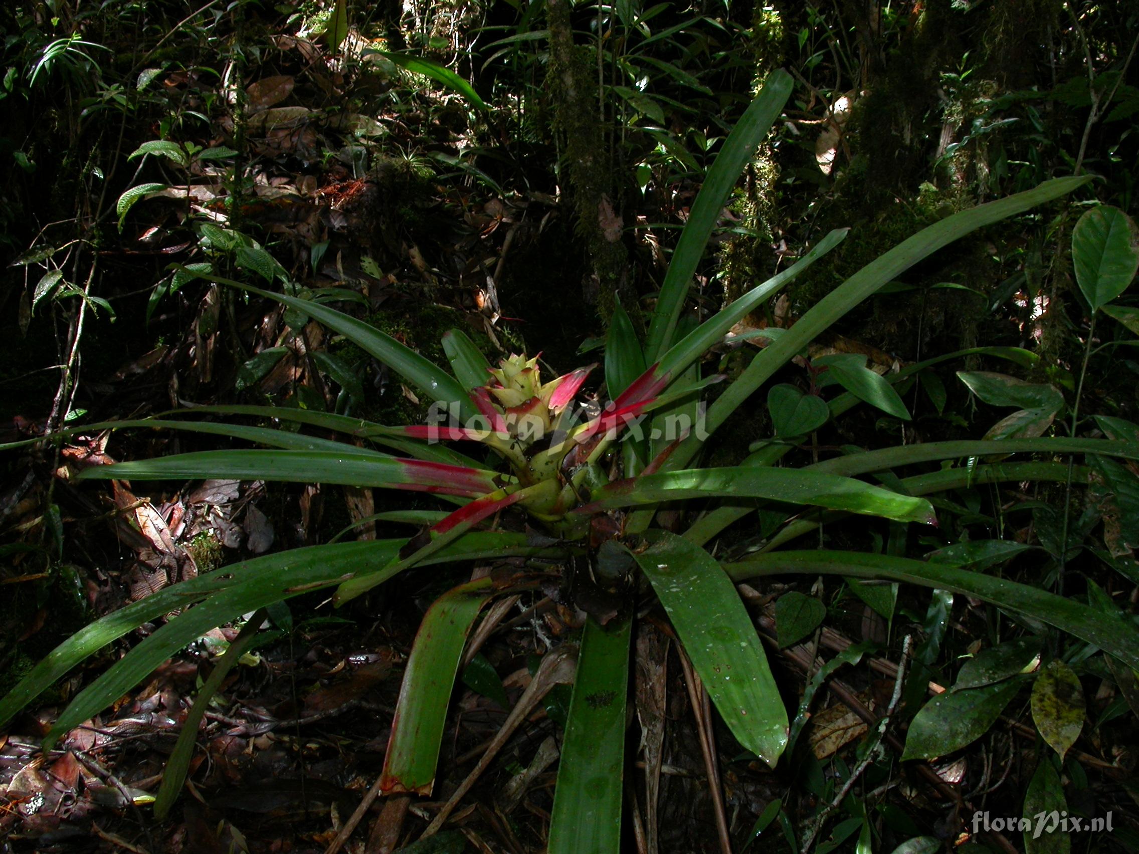 Verzamel locatie: Ecuador - Prov. of Zamora-Chinchipe, area of Estación Cientifica San Francisco (S 03°58“, W 79°04“ ), road Loja-Zamora, ca. 35 km from Loja; moist montane forest Fotograaf: Florian Werner Opmerking: (as Werner, F.A. 1787 ) - Det.: H. Luther (SEL) 2007 "bracts red or green distally, red mid-section and yellow center; flowers bright yellow."