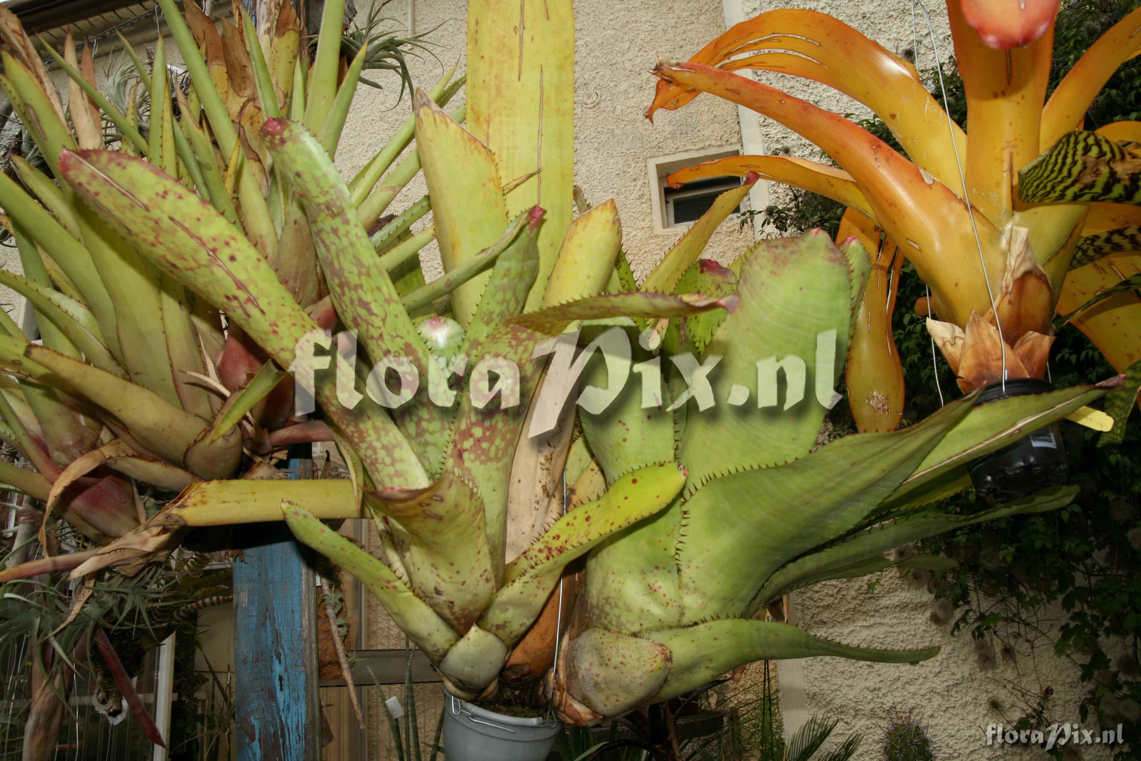 It is looking like a hybrid of N. cruenta. A natural hybrid of N cruenta and N eltoniana could be possible since they occur in the same habitat. However the spines seems to be to big for a N cruenta pattern. N. carcharodon have big spines and occur in municipalities of Macae and Marica (Rio de janeiro State) but in the mountains while N cruenta grow in sand dunes. It is an interesting guessing game!!! - Opmerking (1837): Uwe Scharf (2007-09-08) - I was watching this plant already for some years in the Bot Garden in Utrecht and it was extremely interesting to me because such a huge plant should be known to Ecuador. Finally I got a “cutting” of about 80 cm high in May 2007, put it in a 12 cm pot (looks funny) and hung it up in my garden in half shade, at least protected from direct sunlight during noon. During the last 3 months it showed some new growth at the inner leaves and, what a surprise, it developed a pattern on the leaves that was already faintly visible at some exposed parts of the plant in the Bot Garden in Utrecht (see photo) and what is similar to the pattern of N. marmorata. In my mind I made a guess how the plant could look like when it was grown in full sun for some years and it kicked me out of my socks (sorry for that 1:1 German-English translation) when this virtual picture in my brain was matched 100% by a picture from a saleswoman on the internet (see attached picture) who is selling their plants in Ceasa Campinas in the Market of Flowers. I got in contact with the saleswoman and she told me that the plant is frequently found in the Serra da Bocaina, Eastern Brazil. They sell it under the name Neoregelia johannis. Would this be the right name for that plant in Utrecht? If yes, then the collection site in Ecuador, W of Loja, Catamayo should be revised.