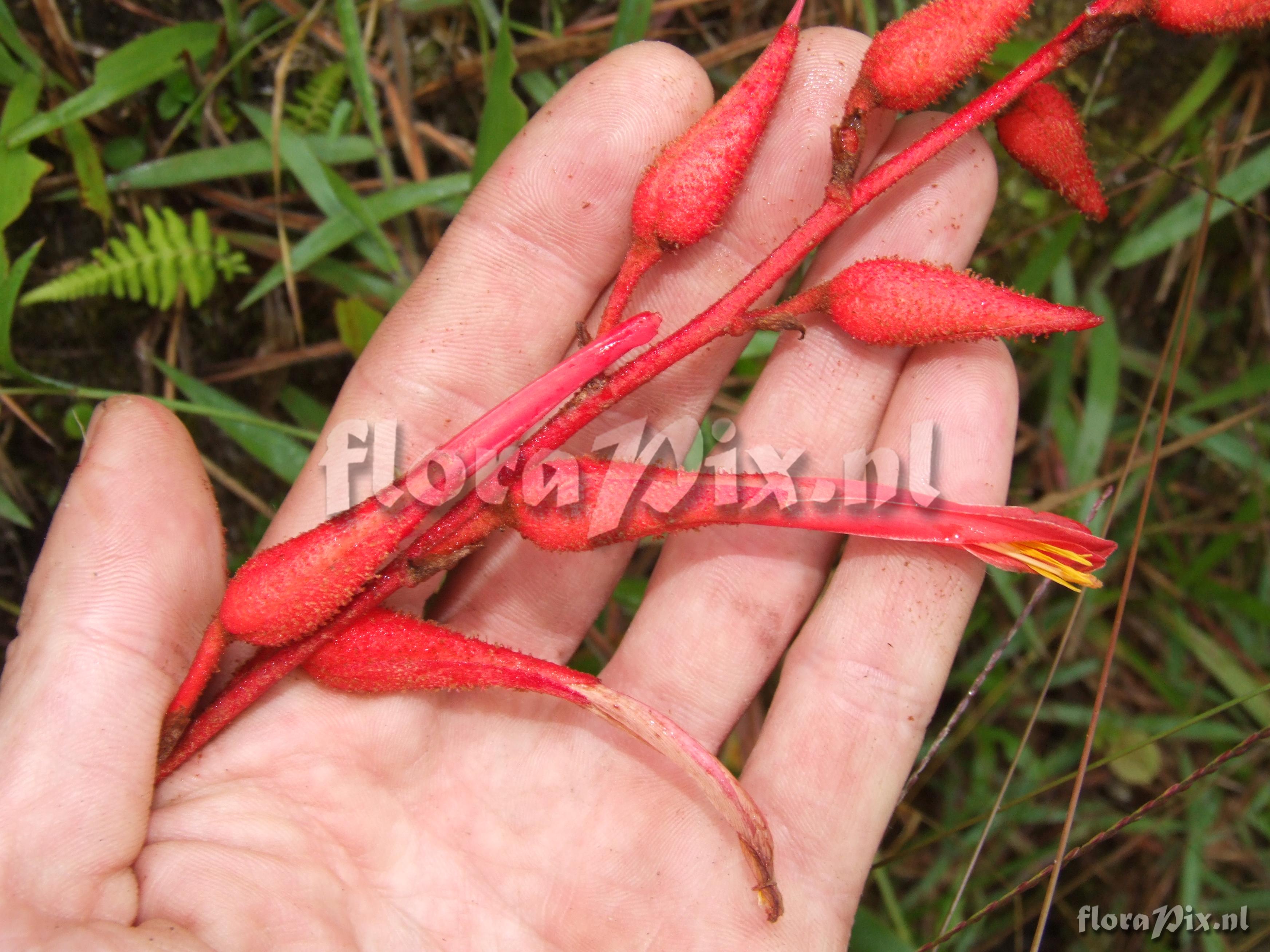 (Geladen als: Pitcairnia ) Verzamel locatie: Ecuador - Prov. of Zamora-Chinchipe, area of Estación Cientifica San Francisco (S 03°58“, W 79°04“ ), road Loja-Zamora, ca. 35 km from Loja; moist montane forest Fotograaf: Florian Werner Opmerking: Col.: Werner, F.A. 1933 (08-08-2006) entire inflorescence bright orange. Determinatie: Opgelost