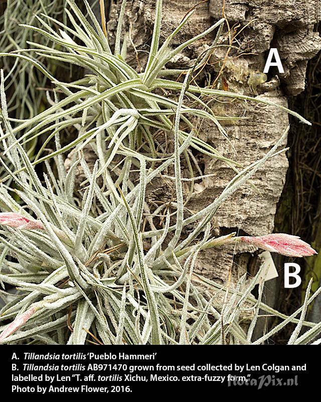 (Geladen als: Tillandsia tortilis) Verzamel locatie: New Zealand - Wellington - Anwyl Bromeliads Nursery, Pukerua Bay Fotograaf: Andrew Flower Opmerking: I don’t think the green effect is due to growing conditions, at least compared to the other T. tortilis AB971470 I have growing here from seed, see new comparative photos – it is a case of a brighter green epidermal layer and less dense leaf scales . Naming this taxon “T. tortilis” is commercially implausible: we have a plant labelled “T. Pueblo x hammeri” that has been in the trade for more than 30 years: now we have decided it is T. tortilis, but I don’t want to start selling it as “T. tortilis” and mislead collectors into buying it thinking it is something new if it is in fact a plant they already have under the old name. So I have registered it in BCR as “Pueblo Hammeri” (pending) so we will sell it as T. tortilis ‘Pueblo Hammeri’ plus a reference to the old name. Note that the T. tortilis AB971470 in the photos is grown from seed collect in Xichu by Len Colgan in 1997 (see caption on attached photo of plants growing side by side). Additional photo of leaves follows. (Verzonden: brom-l@science.uu.nl) Determinatie: Opgelost