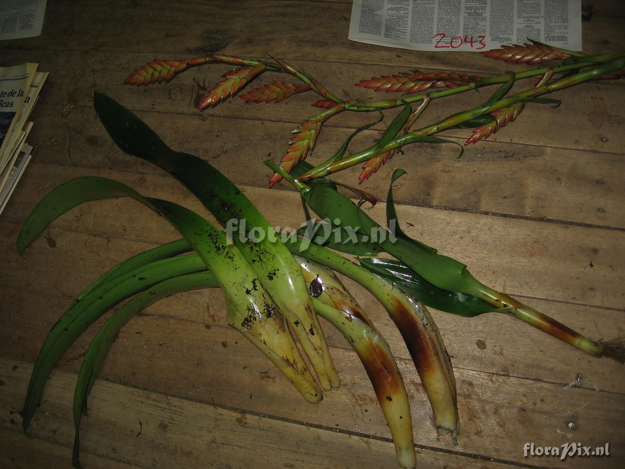 Verzamel locatie: Ecuador - Prov. of Zamora-Chinchipe, area of Estación Cientifica San Francisco (S 03°58´, W 79°04´ ), road Loja-Zamora, ca. 35 km from Loja; moist montane forest Fotograaf: Florian Werner Opmerking: Col.: Werner, F.A. 2043 (15-06-2006) got you! Several other infertile specimens around, infl. cf. co-occurring T. fendleri. Vegetatively Guzmania-like yet unmistakable with blunt, bright green, ribbonlike soft and u-shaped leaves that heavily bent downward right after the tank-base narrows. Infl. 1.5 m tall, with long leafy bracts along lower 2/3, flower bracts pinkish, petals light purple.