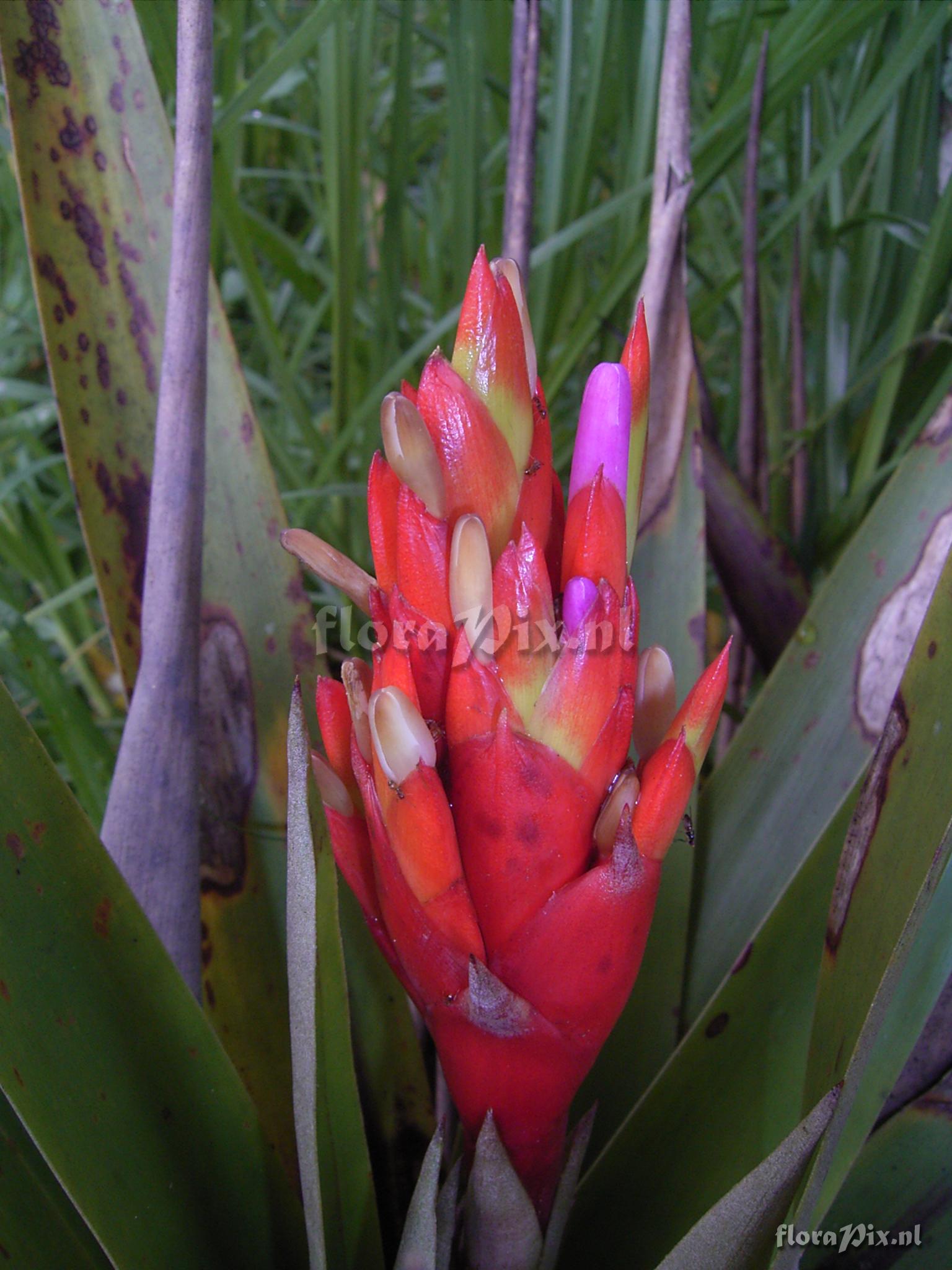Verzamel locatie: Ecuador - Prov. of Zamora-Chinchipe, area of Estación Cientifica San Francisco (S 03°58´, W 79°04´ ), road Loja-Zamora, ca. 35 km from Loja; moist montane forest Fotograaf: Florian Werner Opmerking: Col.: Werner, F.A. 1807 (05-10-2005) - Det.: H. Luther (SEL) 2007 bracts brick-red, corolla whitish (mild) purple. Doesn#t seem to open a lot..